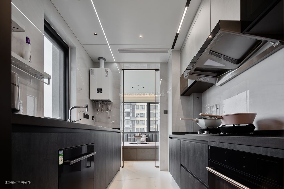 半开放式的厨房空间 减去了厚重的墙面隔屏 也减轻了视觉的重量感 洗切炒安排在两边平行线上 动线迂回不重复,灵活机动