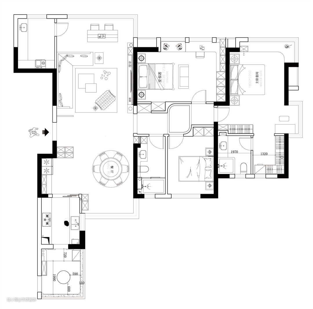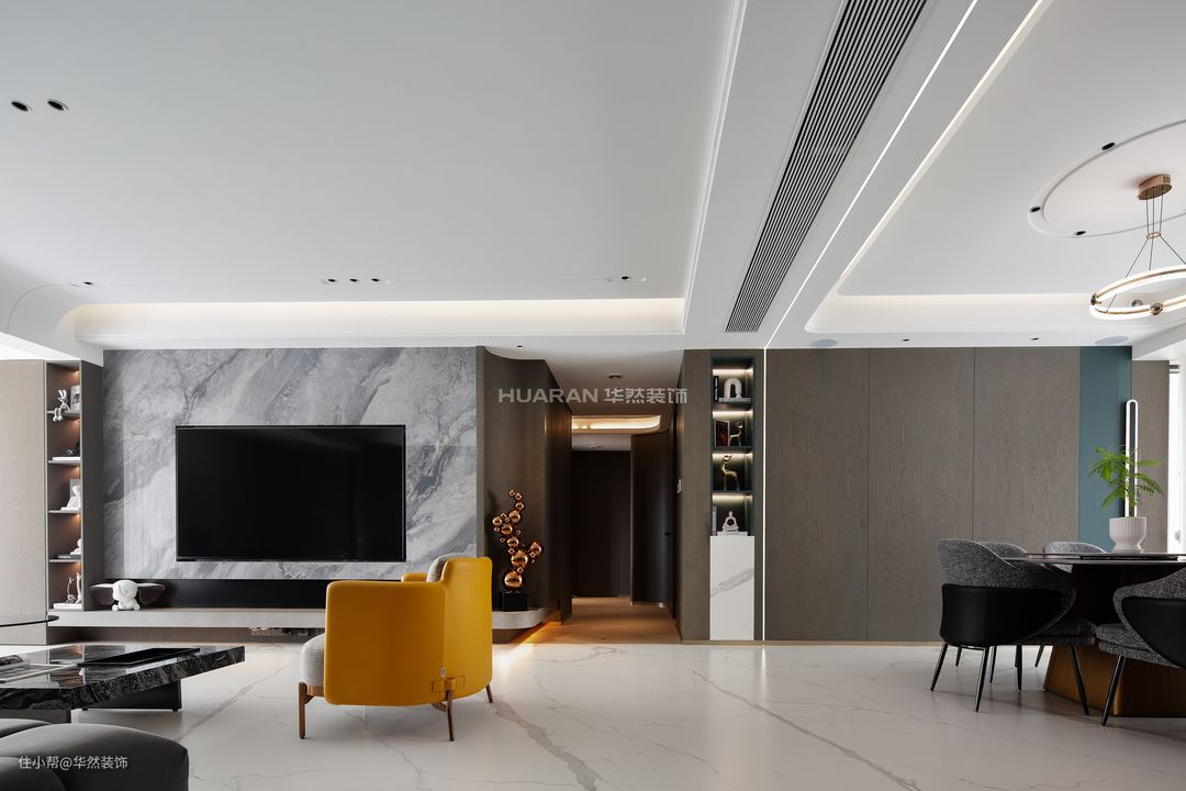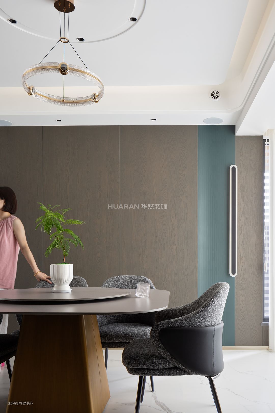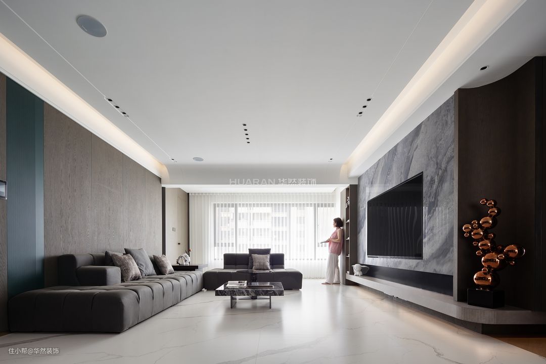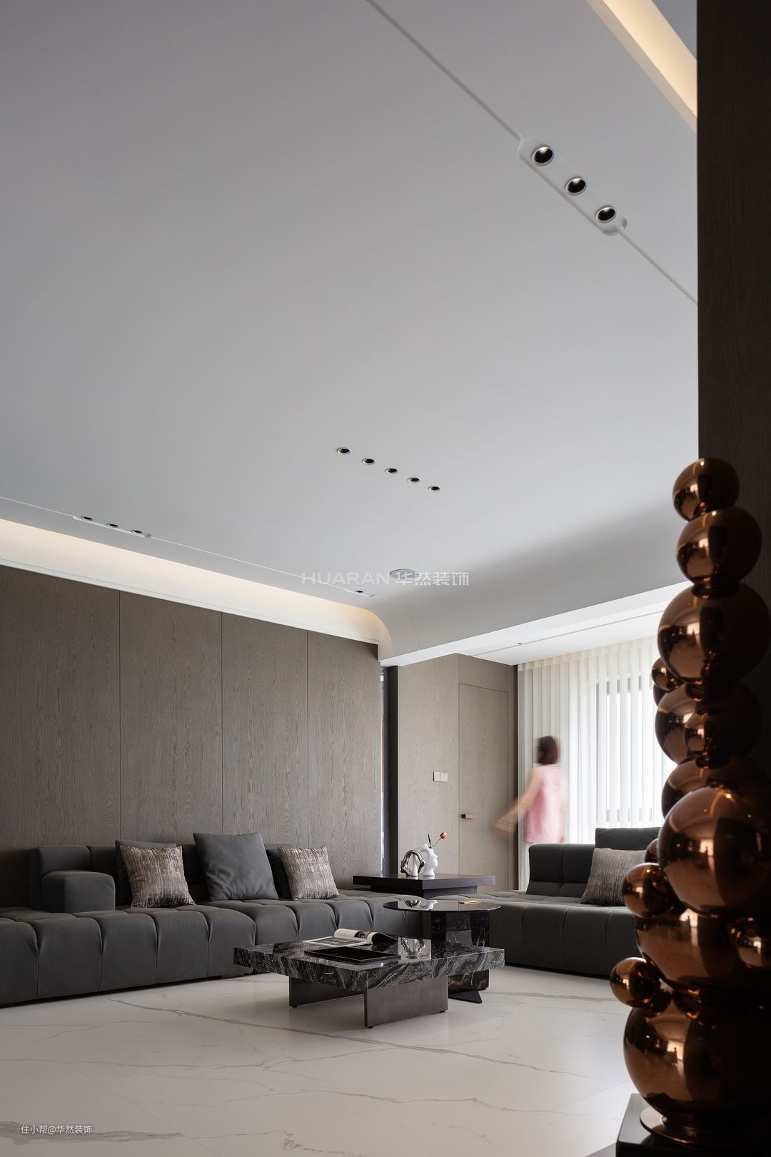 项目信息 项目地址 / 合肥 · 国贸天成 项目户型 / 大平层 项目面积 / 建筑面积170㎡ 项目风格 / 现代 设计施工 / 安徽华然装饰 业主是一家三口,女业主黄女士早年也是家装设计师,为了照顾孩子上学,毅然选择回归家庭。因第一套房子是胡庆来老师设计,整体居住舒适度很赞,所以在装修他们的第二套房子时,也由胡老师全权负责装饰设计。 两梯两户房型,给生活带来高效的便捷性,170平米的面积由四房改为三室,采光通风更佳。 业主需求 1、通往静区的过道被同户型的业主戏称为“曲径通幽”,可见过道是本户型最大的缺点。 2、晾晒在阳台上,不管是对阳台的观感,还是采光都有一定的影响。 3、两个朝南次卧开间不足3m,格局和功能性受影响。 设计改造 1、一部分南阳台成为客厅的延伸,另一部分做成独立的家政间,提高阳台功能性。 2、设备平台变成餐厅的一部分,餐厅空间更加宽敞开阔。 3、与厨房相连的设备平台做茶室,满足男业主品茶的爱好。 4、朝南两个次卧合二为一,兼顾书房和睡眠功能。 5、通过卧室的过道转角处,做对角弧形设计,金属做顶,灯光为辅,把弊端变成亮点。 6、主卫与衣帽间调换位置,提高生活便捷度。