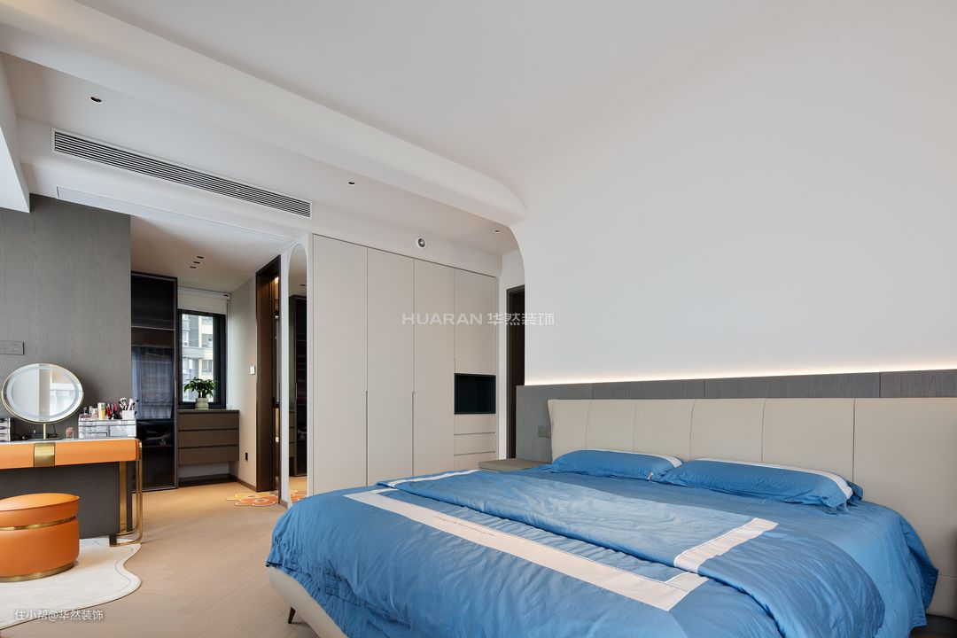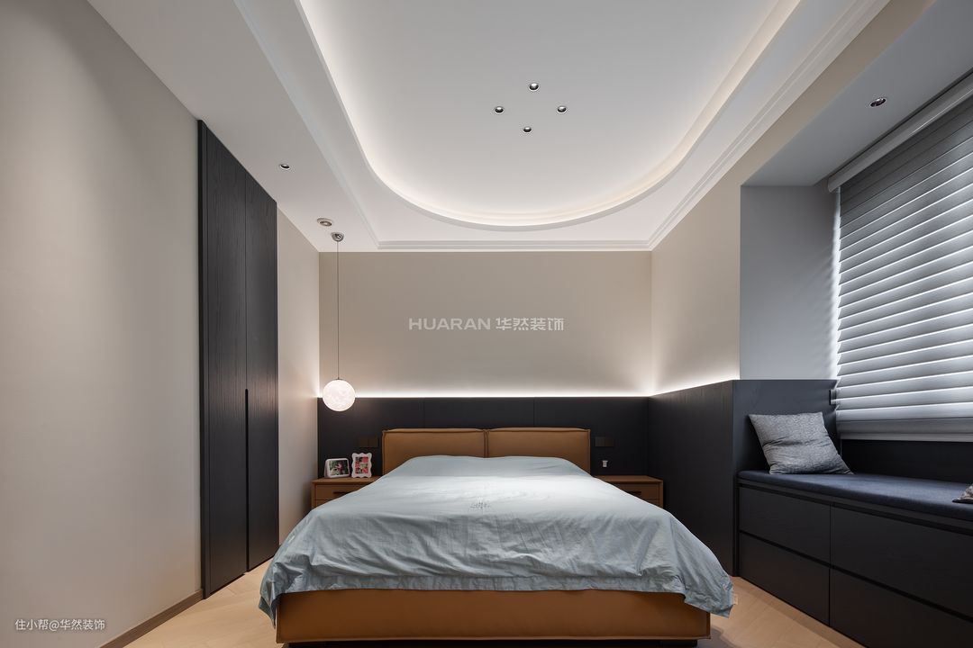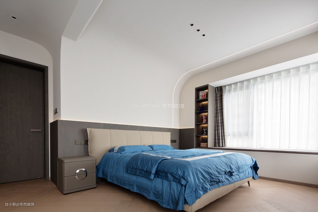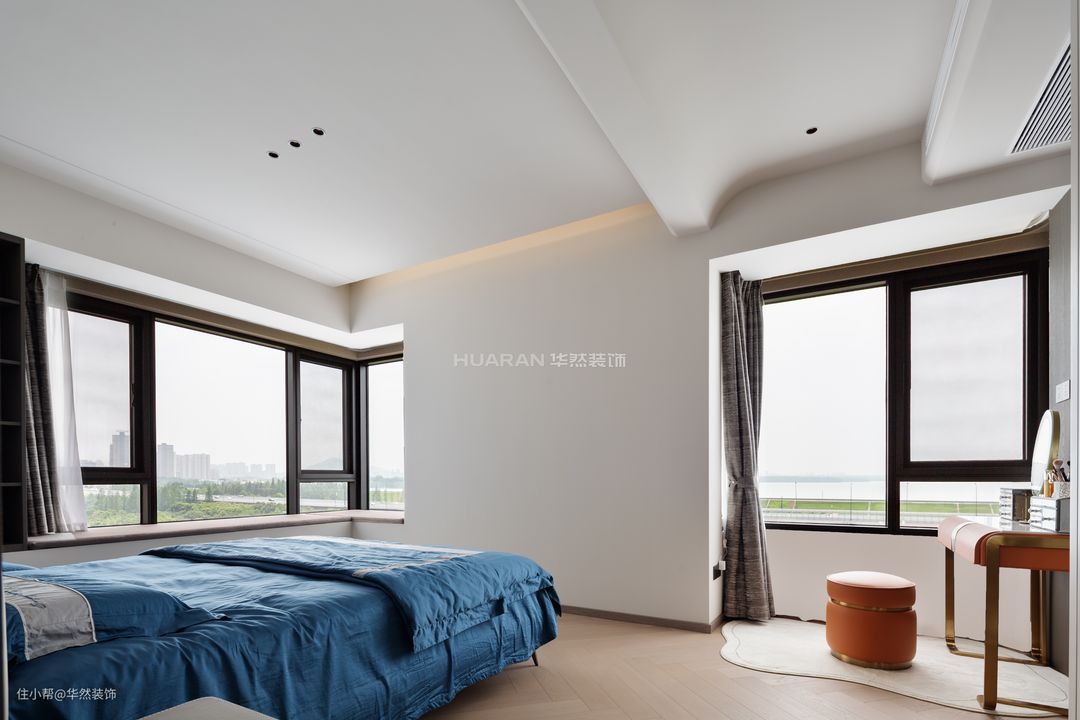 主卧两面环窗,大美湖景尽收眼底 顶墙之间弧形收口 线性灯带勾勒吊顶轮廓,提升视觉层高。 半墙木饰面从入户沿墙面一直延续到飘窗 在简约的空间里增加体块 形成连贯的空间感受,营造明暗层次