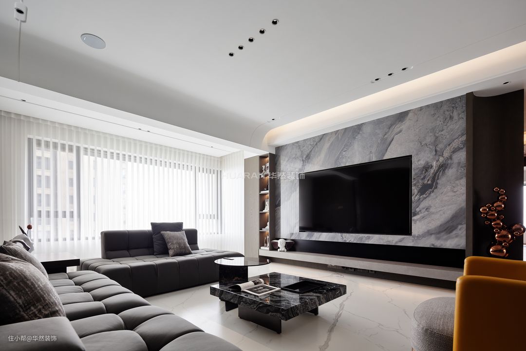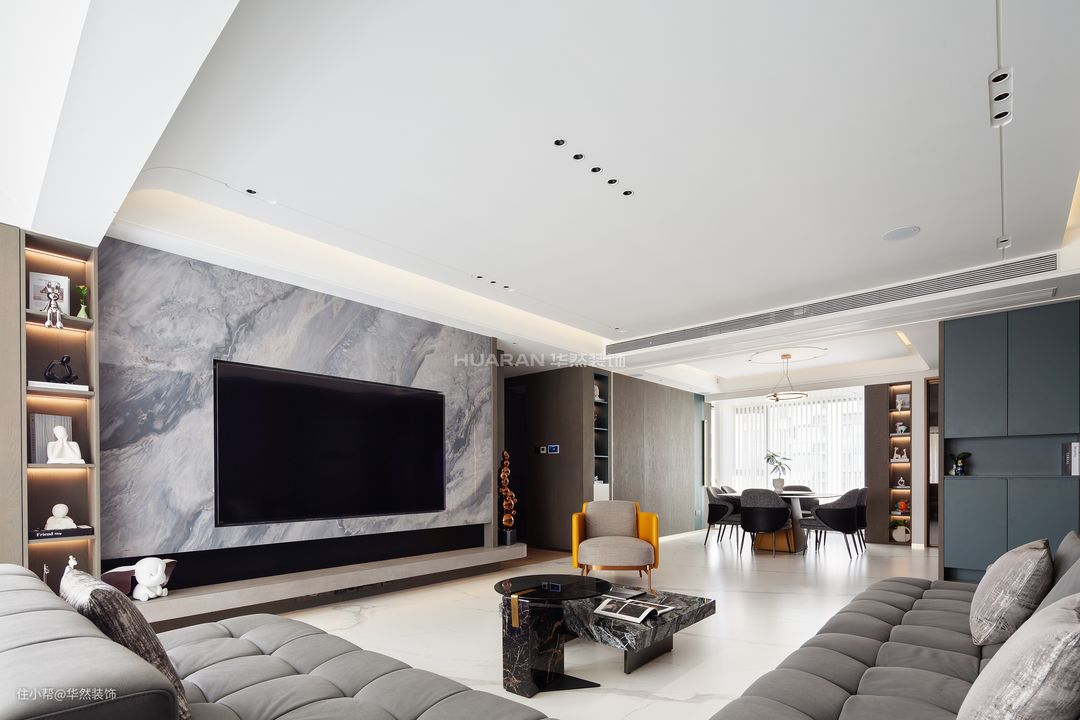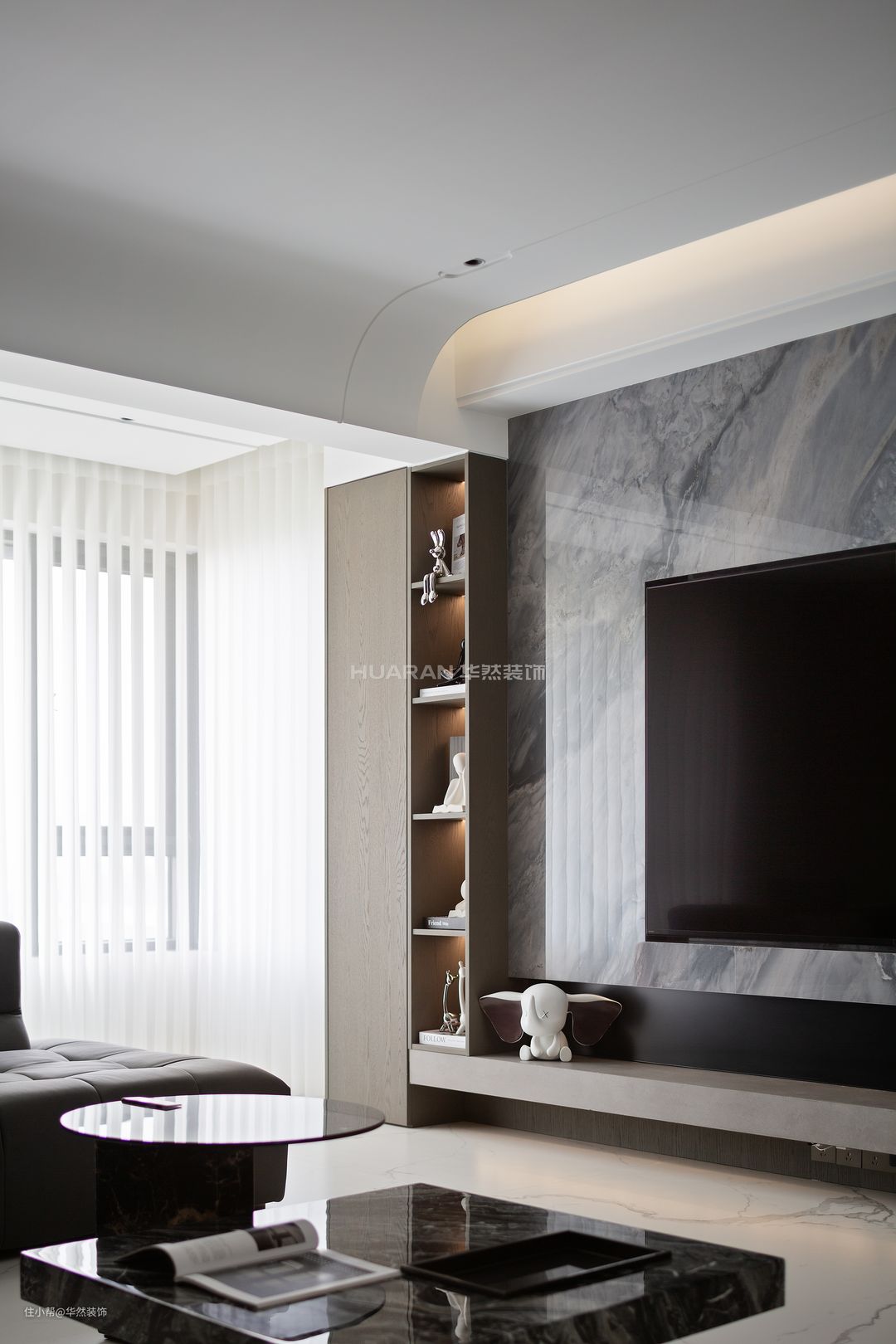 自带气场的高颜值岩板 通铺客餐厅地面,是这个家的亮点 将一部分阳台变成客厅的延伸 日光能更好地透进室内 从而投射出深色系的纹理和线条 感受深色系的张力,让整个空间更加的饱和 弧形造型的处理 实现客厅与阳台吊顶的平缓过渡 弱化横梁的突兀感,灯带通过隐藏式设计 沿着吊顶轮廓打造出独特的造型 极大丰富空间层次 深色岩板电视背景墙作为客厅主视觉的延伸 通过线条分割与木材质的融合 形成余味无穷的质感精致空间 悬空地台与开放置物格适当结合 视觉轻盈通透,抵消深色调的封闭感