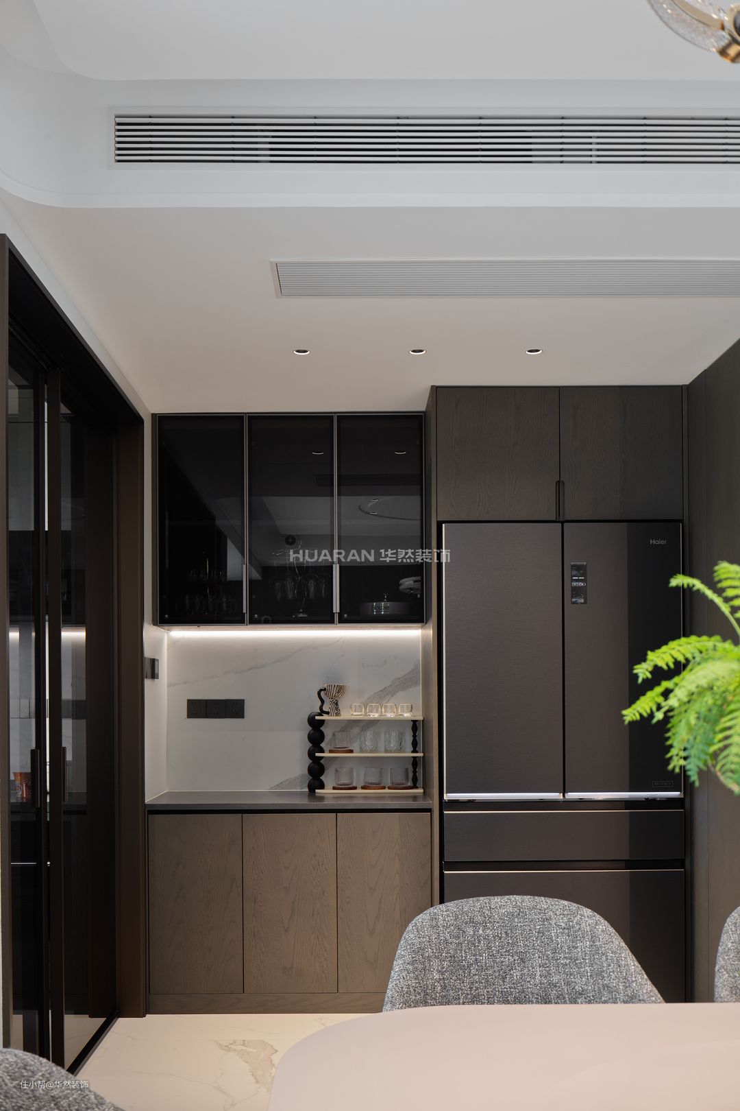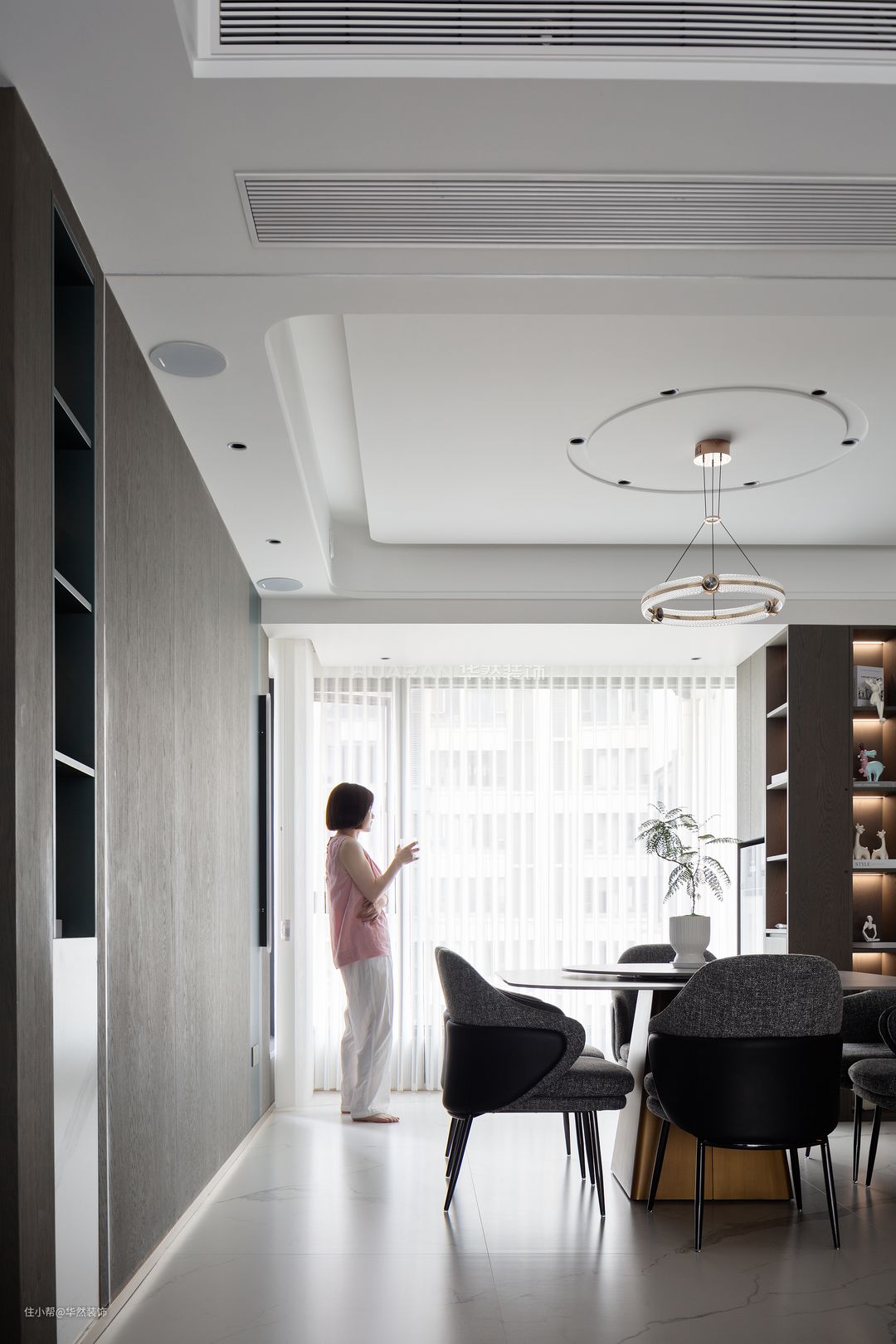 客厅看向餐厅的视野,设备平台的扩入 一定程度增加这个区域的使用面积 开放式用餐空间舒张通透 清晰流畅的线条层次 营造了流动性的空间氛围 餐厅墙面合理规划使用木饰面的范围 左右进行色彩比例分配 以独特而创意的视觉效果 提高整体的精致度 餐边柜与鞋柜背对背设计 色调与材质一体化 把控好尺寸,实现双开门冰箱的完美嵌入