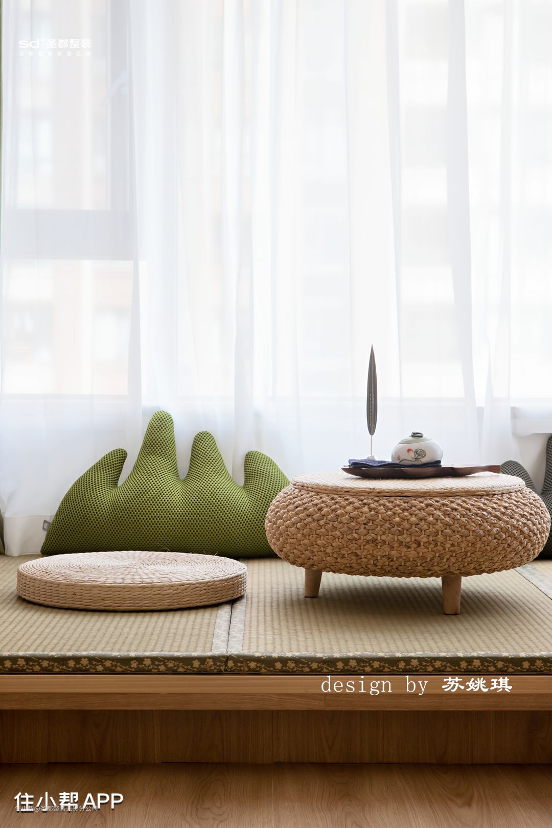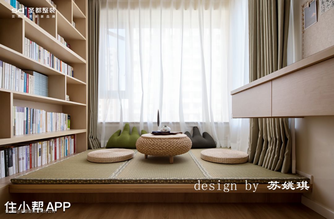 由于进门北面房间作为书房使用,不需要太大的空间。于是从书房面积让出了朝餐厅的冰箱和储物柜的位置,配合承重墙与书房的书柜做平,即修饰了承重柱,又满足了空间对储物的需求。在书房设计了地台区域,抬高地面以作功能区分,摆放小茶桌铺上竹席和蒲团,打造禅意茶室。