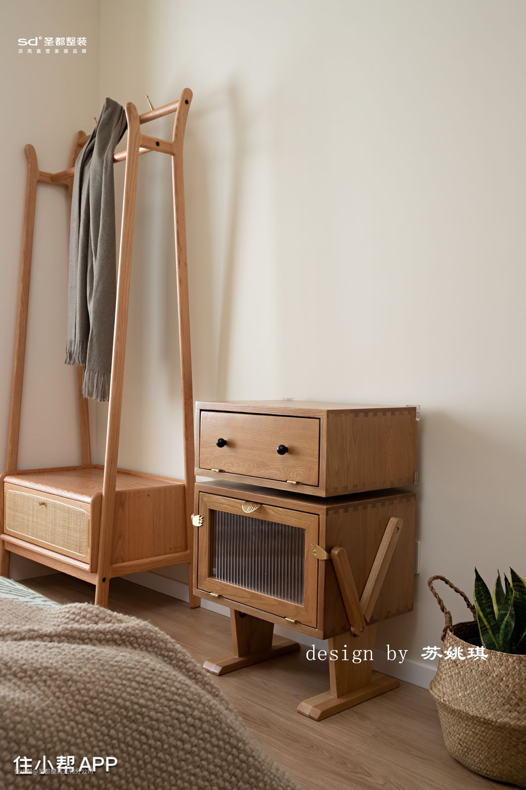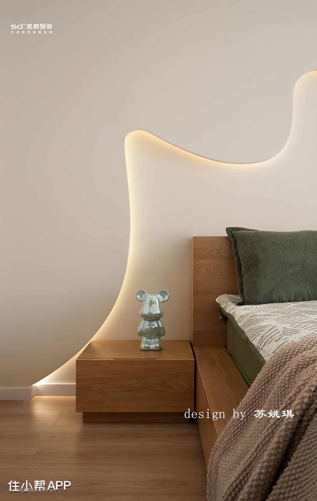 主卧简单干净,隐形门后藏着小小的衣帽间,不同的厚度对应着不同的功能,叠衣区、挂衣区,衣物自此也有了去处。用隐形门遮挡了衣帽间的入口,墙面整体统一。主卧吊顶无主灯设计,用两侧圆弧弱化高低差,简单的灯具设计,整体色调以浅色为主,低饱和度的软装搭配,清新脱俗的浪漫主义。 床背景设计,以不规则圆弧曲线配以灯带强调分割。地台床被暖色微光渲染,延伸出一个温柔的舒适圈。主卧打通了阳台,小小一张单椅,一张柔软的地毯,解锁生活的阅读角。高深不凡的思想哲学,引人入胜的古典诗词,皆随着片片思绪入梦。 机器人多功能柜,让零零碎碎的物件都有收纳归置的地方。小脑袋可以随意旋转,非常丝滑。