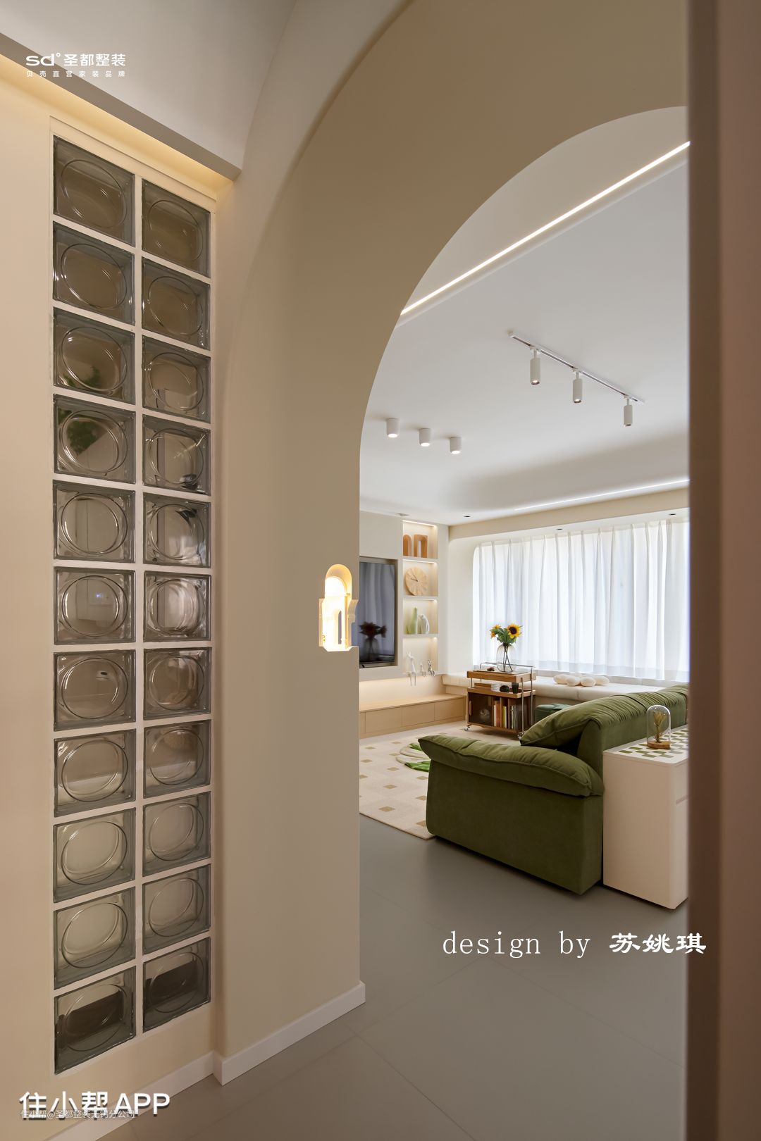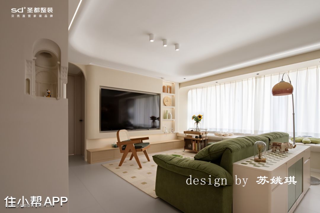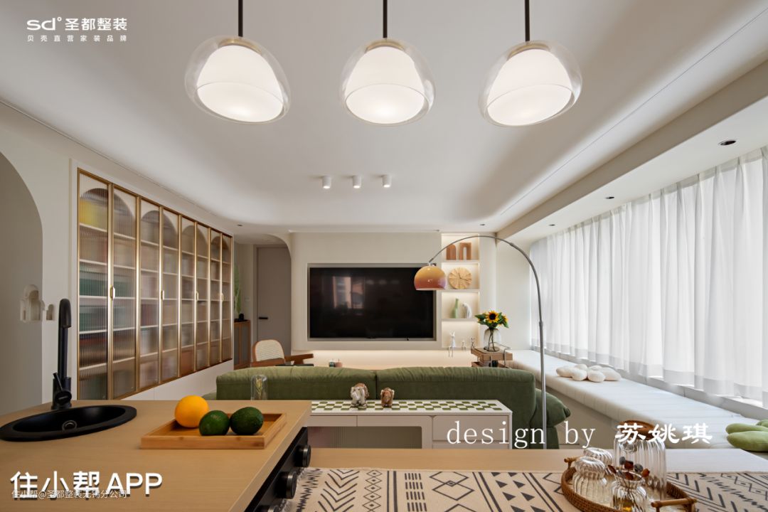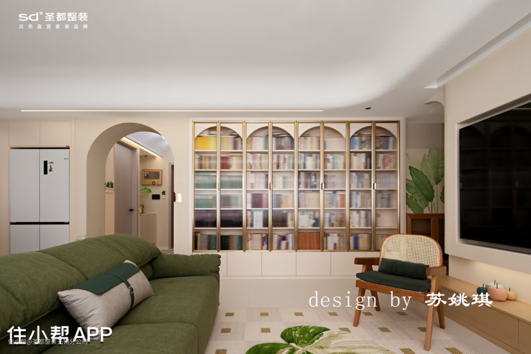 客厅沙发挨着飘窗,长长飘窗垫一铺,客人再多也有地方坐了。下午静沐阳光,躺坐在飘窗上,一杯咖啡伴着一本书,真是千金难买的好时光。 吊顶设计以保留原有层高为原则,配合圆弧造型削弱明显的高度层级差,柔化整个空间的造型。灯具选择尽可能干净简单的造型,例如明装筒灯,简单白色轨道射灯,落日氛围感钓鱼灯拿捏vintage味道。 石膏镂空壁灯,是来自转角的仪式感。万神殿壁龛造型,让光的艺术得到升华,普通的小角落也能秒变艺术展。 在客厅区域设计了一整面的书墙,改变传统书架的笨重+普通。拱形柜门造型搭配影影绰绰的长虹玻璃,温柔又细腻,颇有法式中古风的味道。 胡桃木移动小推车,精致感满满。柔和的奶油色干净通透,没有一丝冗余,令人感到家的归属于放松。