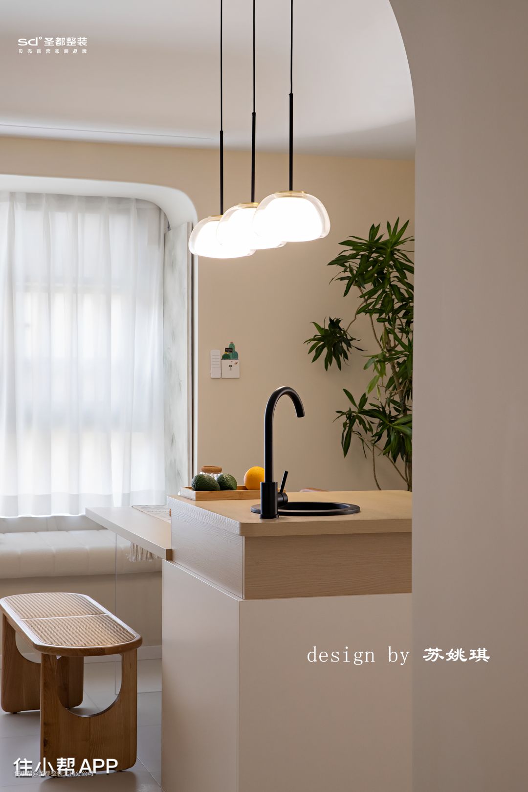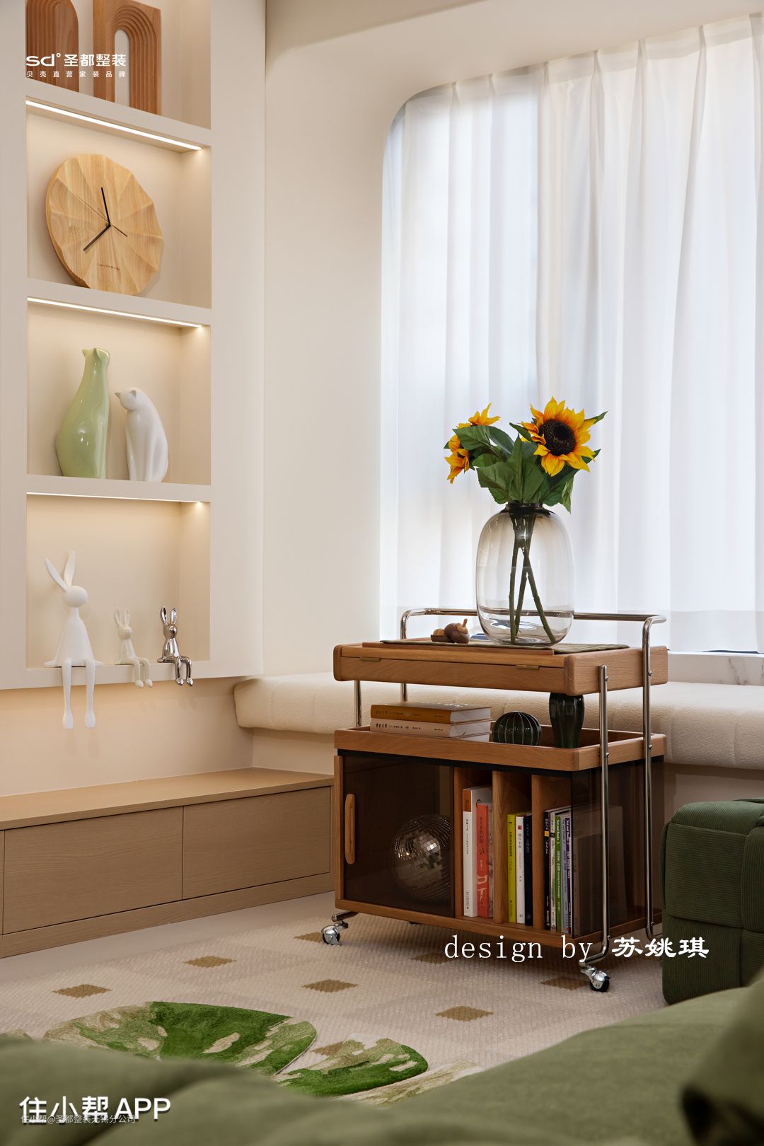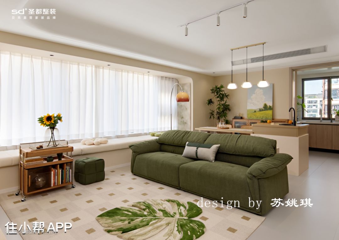 客厅沙发挨着飘窗,长长飘窗垫一铺,客人再多也有地方坐了。下午静沐阳光,躺坐在飘窗上,一杯咖啡伴着一本书,真是千金难买的好时光。 吊顶设计以保留原有层高为原则,配合圆弧造型削弱明显的高度层级差,柔化整个空间的造型。灯具选择尽可能干净简单的造型,例如明装筒灯,简单白色轨道射灯,落日氛围感钓鱼灯拿捏vintage味道。 石膏镂空壁灯,是来自转角的仪式感。万神殿壁龛造型,让光的艺术得到升华,普通的小角落也能秒变艺术展。 在客厅区域设计了一整面的书墙,改变传统书架的笨重+普通。拱形柜门造型搭配影影绰绰的长虹玻璃,温柔又细腻,颇有法式中古风的味道。 胡桃木移动小推车,精致感满满。柔和的奶油色干净通透,没有一丝冗余,令人感到家的归属于放松。