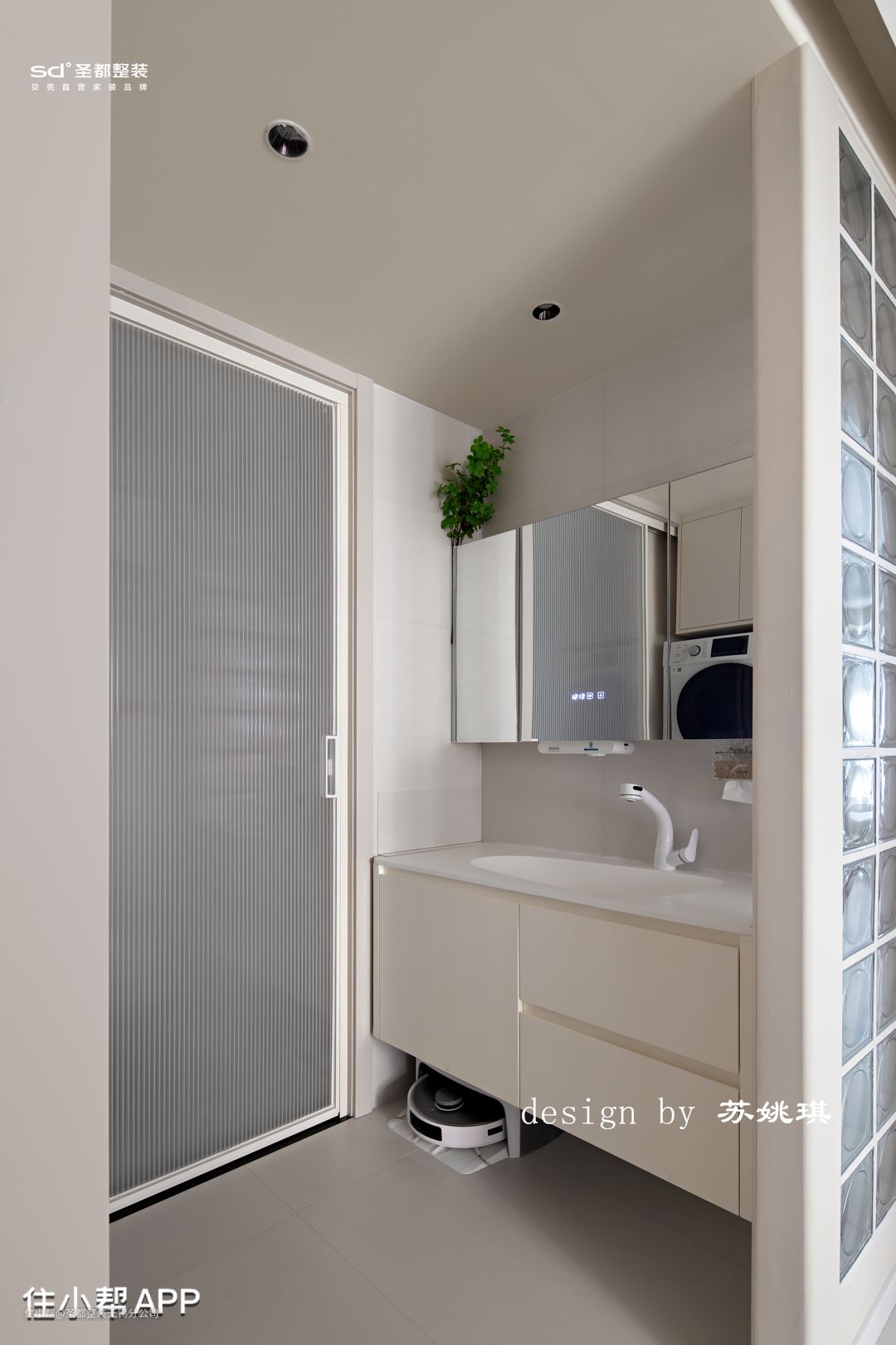 进门的左手边设计了干湿分离的卫生间,叠放的洗烘机,配合储物柜,收纳晾烫一次搞定,小小干区一秒变成家政间。金属移门隔离开湿区,台盆下方设计了自动上下水的扫地机器人,家务也能解放双手,台盆侧边同样没有用实墙隔离。 玻璃砖配合白水泥,方方正正,防水防潮又兼顾隐私,晶莹剔透折射的光线自带美感。