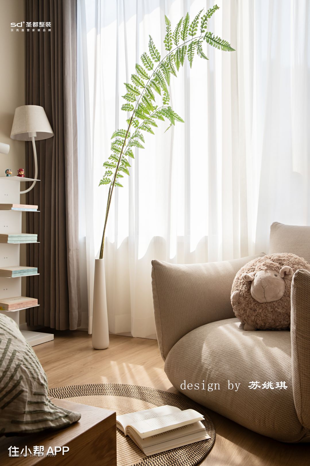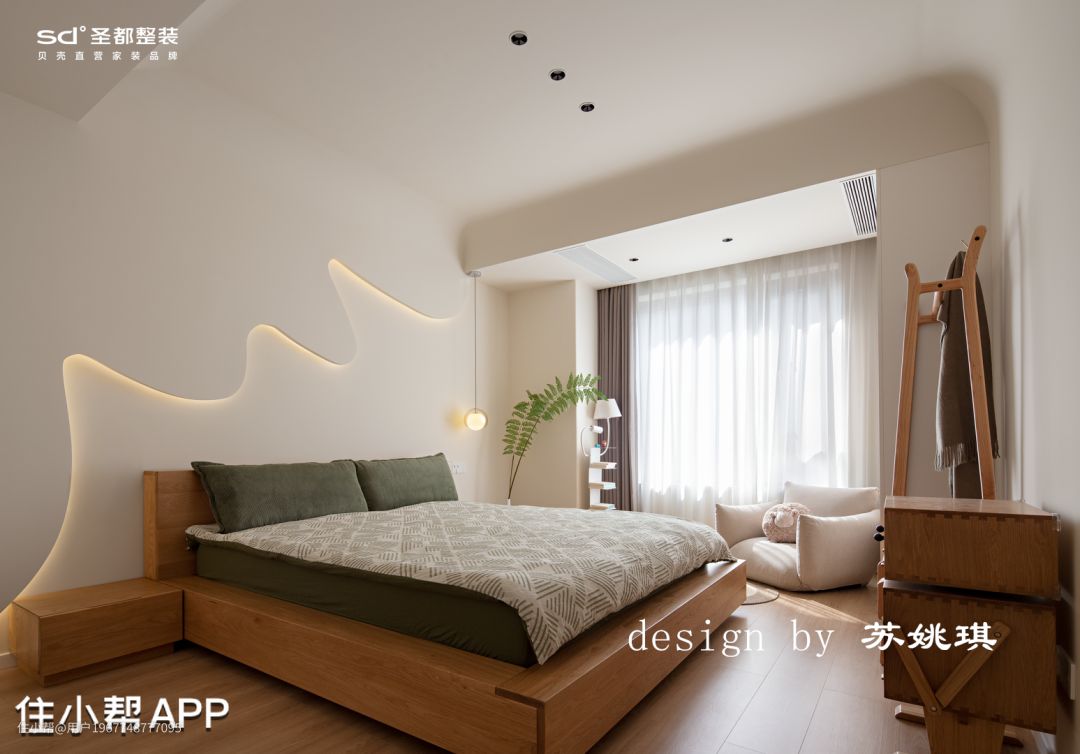 主卧简单干净,隐形门后藏着小小的衣帽间,不同的厚度对应着不同的功能,叠衣区、挂衣区,衣物自此也有了去处。用隐形门遮挡了衣帽间的入口,墙面整体统一。主卧吊顶无主灯设计,用两侧圆弧弱化高低差,简单的灯具设计,整体色调以浅色为主,低饱和度的软装搭配,清新脱俗的浪漫主义。 床背景设计,以不规则圆弧曲线配以灯带强调分割。地台床被暖色微光渲染,延伸出一个温柔的舒适圈。主卧打通了阳台,小小一张单椅,一张柔软的地毯,解锁生活的阅读角。高深不凡的思想哲学,引人入胜的古典诗词,皆随着片片思绪入梦。 机器人多功能柜,让零零碎碎的物件都有收纳归置的地方。小脑袋可以随意旋转,非常丝滑。