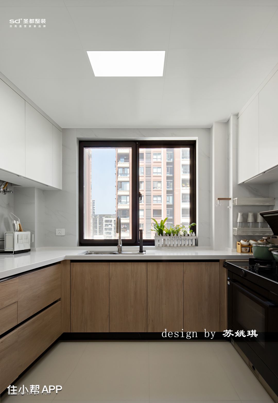 传统U字形厨房橱柜台面,洗、切、备、炒都有专属空间,搭配带有蒸烤箱的集成灶,开启幸福烹饪之旅。