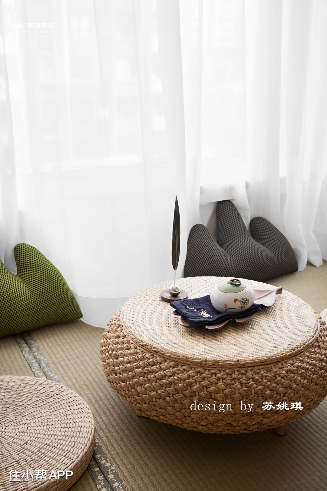 由于进门北面房间作为书房使用,不需要太大的空间。于是从书房面积让出了朝餐厅的冰箱和储物柜的位置,配合承重墙与书房的书柜做平,即修饰了承重柱,又满足了空间对储物的需求。在书房设计了地台区域,抬高地面以作功能区分,摆放小茶桌铺上竹席和蒲团,打造禅意茶室。