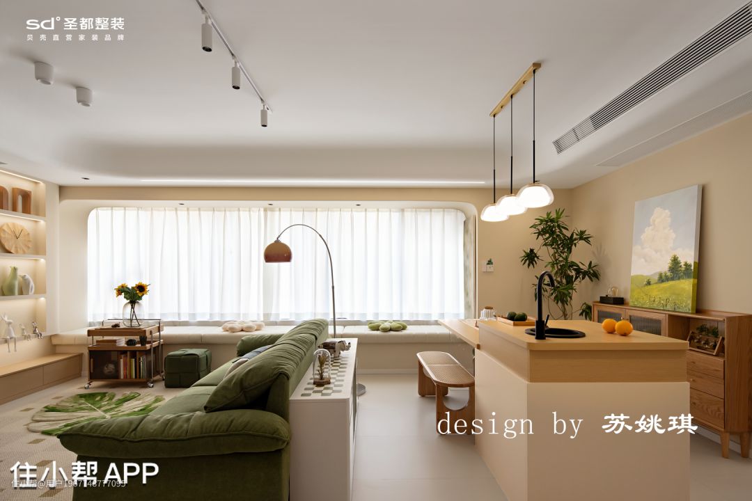 客厅沙发挨着飘窗,长长飘窗垫一铺,客人再多也有地方坐了。下午静沐阳光,躺坐在飘窗上,一杯咖啡伴着一本书,真是千金难买的好时光。 吊顶设计以保留原有层高为原则,配合圆弧造型削弱明显的高度层级差,柔化整个空间的造型。灯具选择尽可能干净简单的造型,例如明装筒灯,简单白色轨道射灯,落日氛围感钓鱼灯拿捏vintage味道。 石膏镂空壁灯,是来自转角的仪式感。万神殿壁龛造型,让光的艺术得到升华,普通的小角落也能秒变艺术展。 在客厅区域设计了一整面的书墙,改变传统书架的笨重+普通。拱形柜门造型搭配影影绰绰的长虹玻璃,温柔又细腻,颇有法式中古风的味道。 胡桃木移动小推车,精致感满满。柔和的奶油色干净通透,没有一丝冗余,令人感到家的归属于放松。