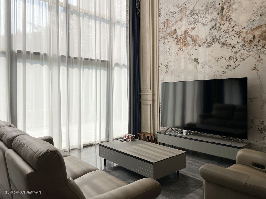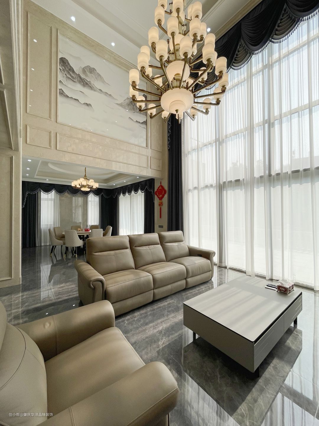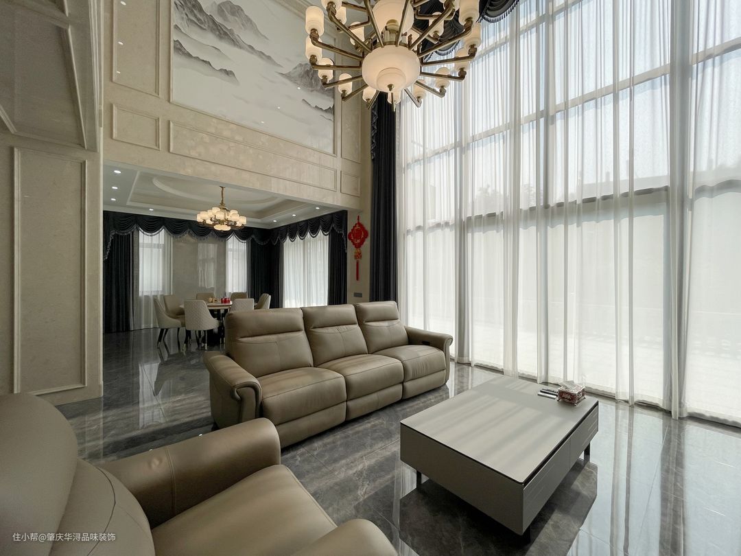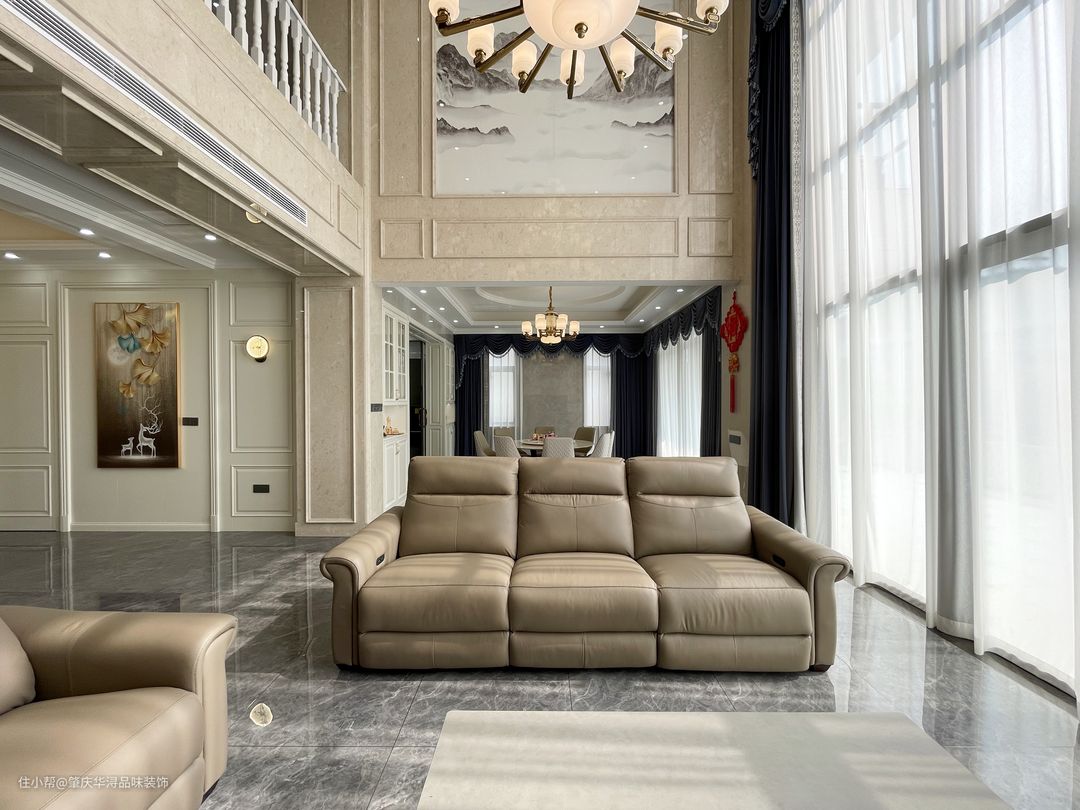 空间的极度利用及特殊的处理,使一切浑然天成,挑高空间的处理,保留原始结构,让空间更加自然舒适,营造柔光氛围,凸显生活区域。中轴线对称设计,让大宅更有仪式感。 传统的欧式吊灯,经典元素精致应用,精炼的语言散发出妩媚优雅的情思,咖啡色的沙发,深灰色窗帘,岩板背景墙,在柔和明快的空间里勾勒出极强的立体层次感。