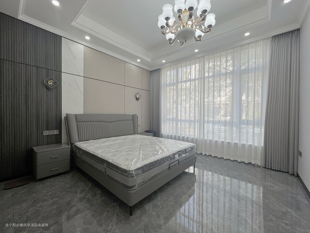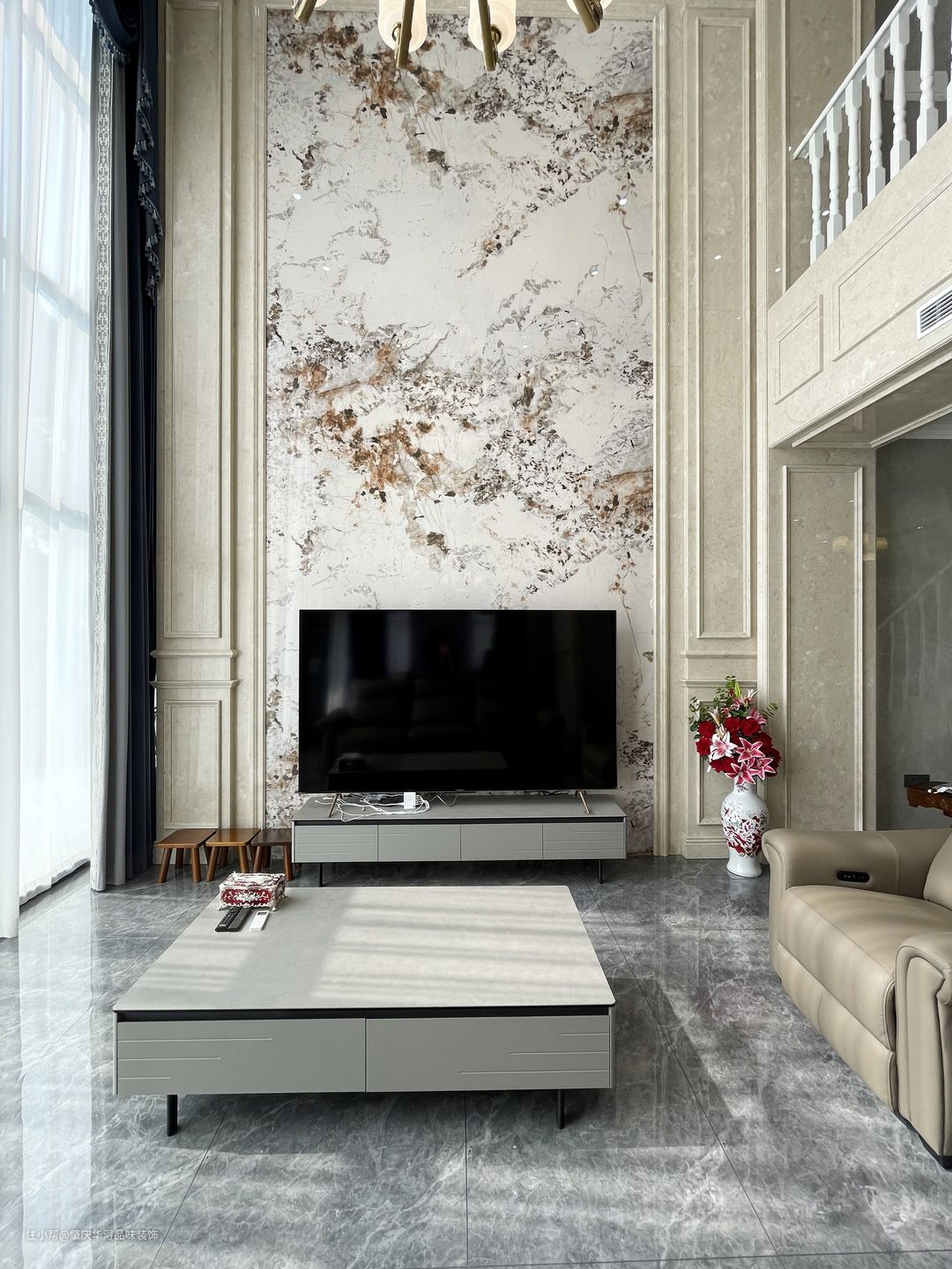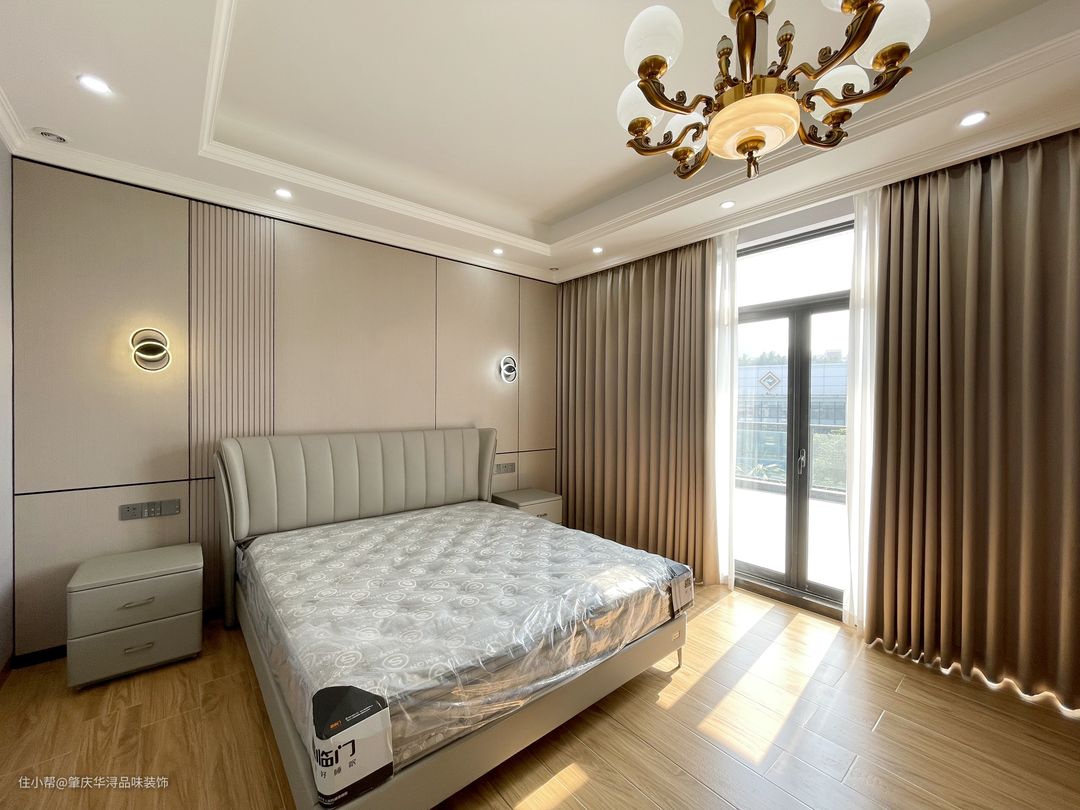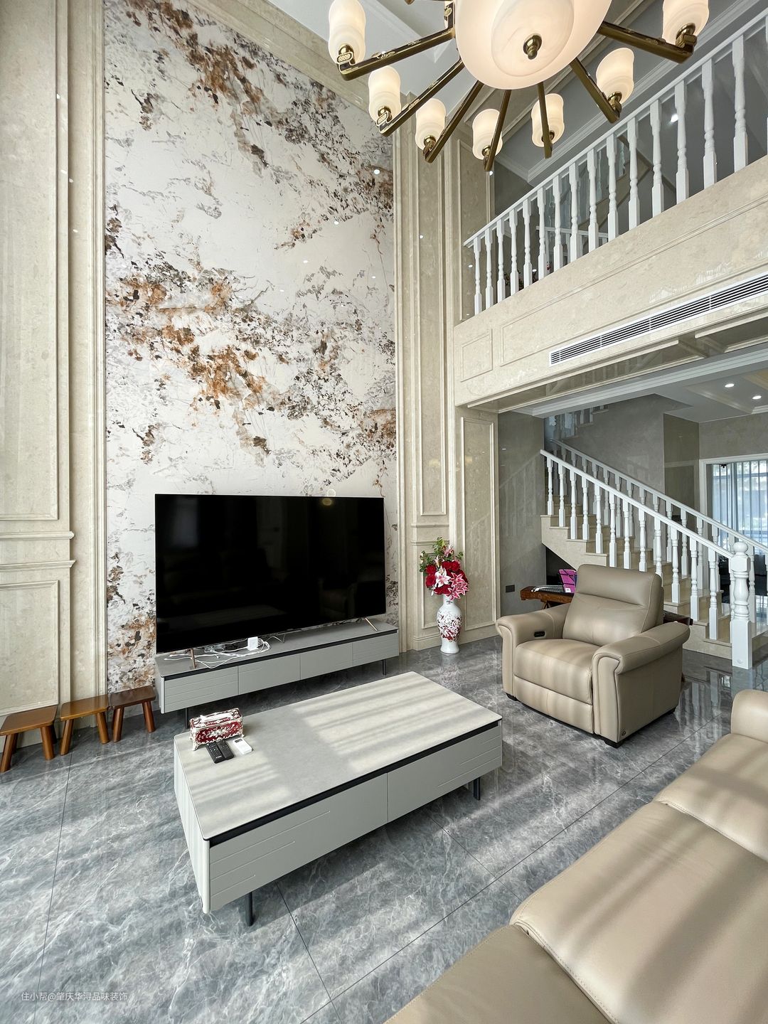 空间的极度利用及特殊的处理,使一切浑然天成,挑高空间的处理,保留原始结构,让空间更加自然舒适,营造柔光氛围,凸显生活区域。中轴线对称设计,让大宅更有仪式感。 传统的欧式吊灯,经典元素精致应用,精炼的语言散发出妩媚优雅的情思,咖啡色的沙发,深灰色窗帘,岩板背景墙,在柔和明快的空间里勾勒出极强的立体层次感。