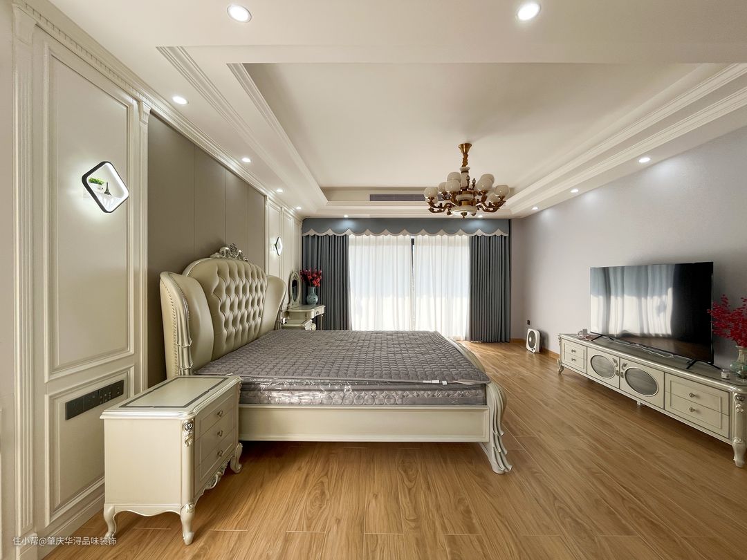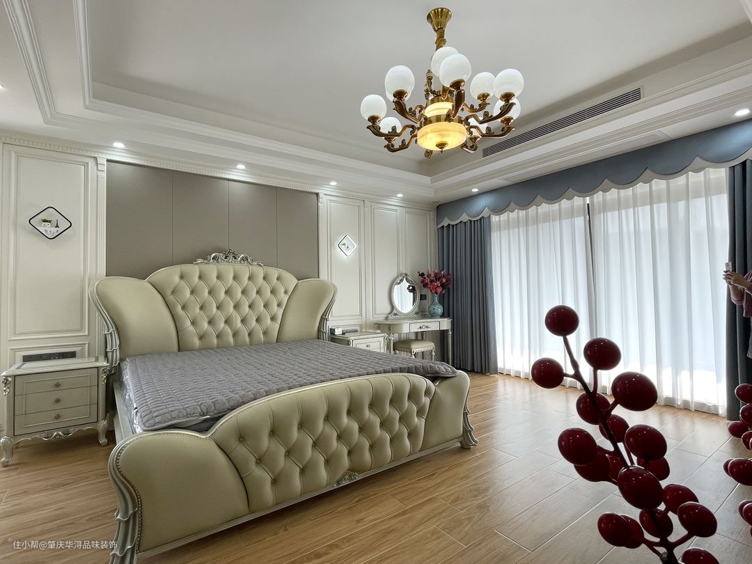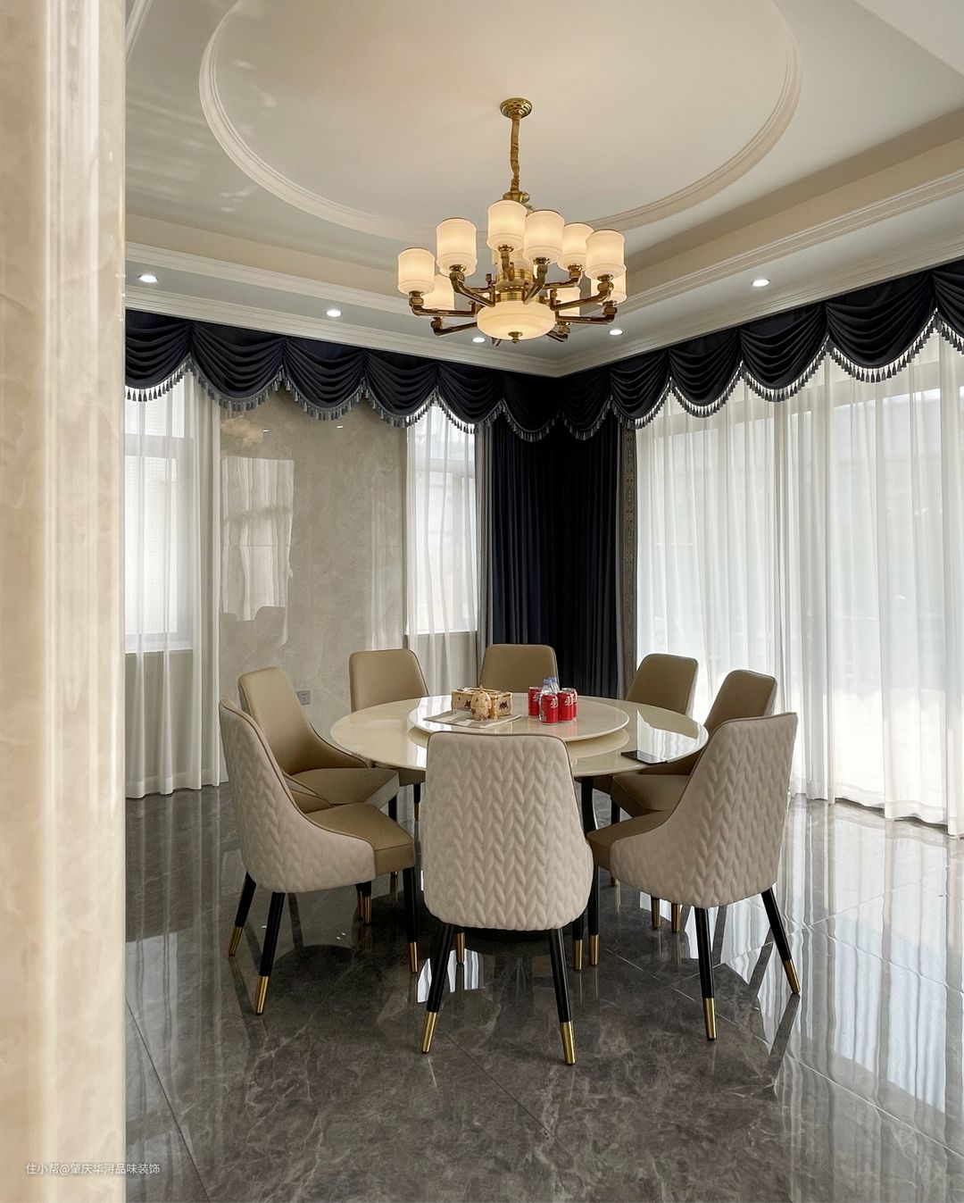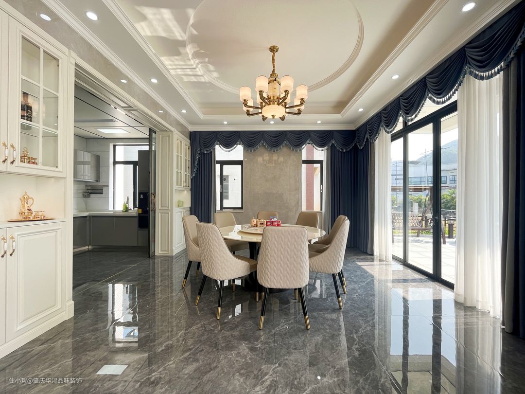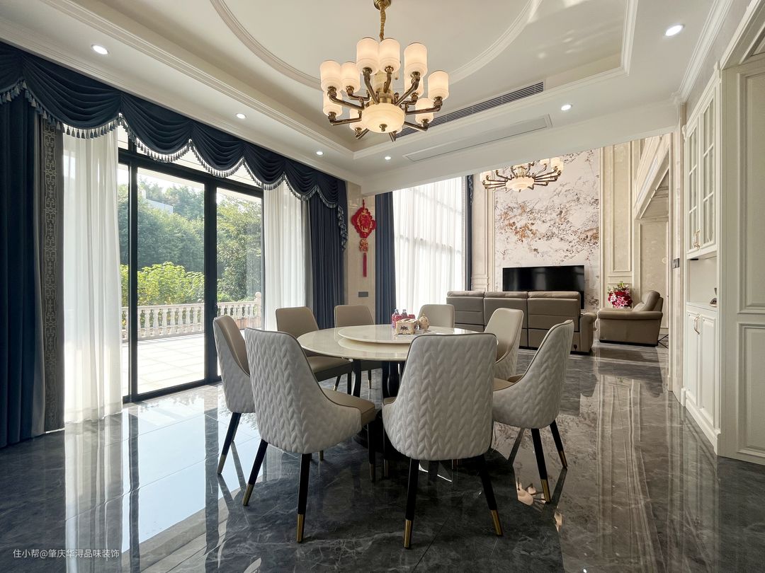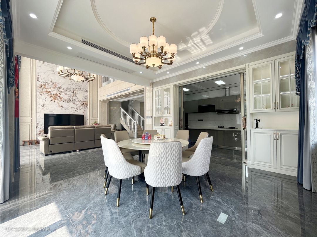 本案装修采用的简欧家居风格,华丽的装饰、浓烈的色彩、精美的造型、多变的线条,制造雍容华贵的气场。客厅家具以简洁的真皮家居为主,恰到好处地选软装让空间繁而不杂。大理石与岩板上墙的设计,在一定程度上为空间奢华氛围打下基础,大理石门廊、吊灯等设计,精致的生活 顷刻体现出来。成为空间的点缀色,改变单一的色调,彰显主人不凡的品味。餐厅顶面圆形吊顶,更符合空间调性的同时,讲述着背后的文化底蕴与历史故事,真皮座椅的融入空间显得更加活跃。奶白色的木制楼梯经过精细的抛光打磨,平滑流畅,闪耀着光泽。