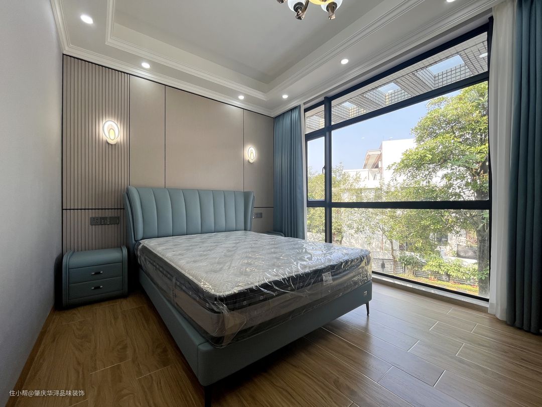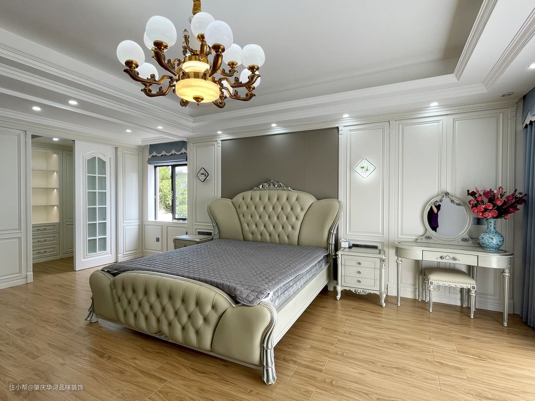 一楼长辈房配有套卫设计,方便日常生活,床头背景采用了格栅与护墙板的元素,造型简洁大方,女儿房的设计以梦幻温馨的设色搭配为主,触动着我们内心深处的少女心,那是青春的象征,带着人生若只如初见的美好。