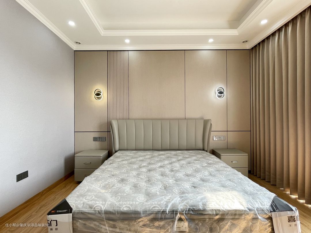 延续了公共空间的色彩搭配,以恬静的浅米色为主,搭配温和的灰绿色,营造宁静和自然的空间感,床头两侧对称的壁灯来装饰墙面,与客厅电视背景的设计手法相呼应
