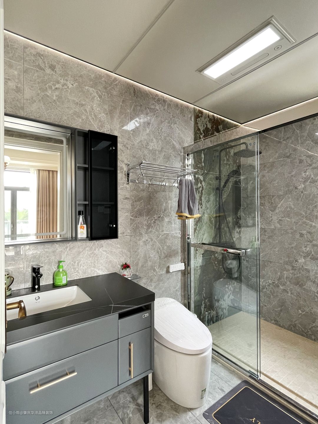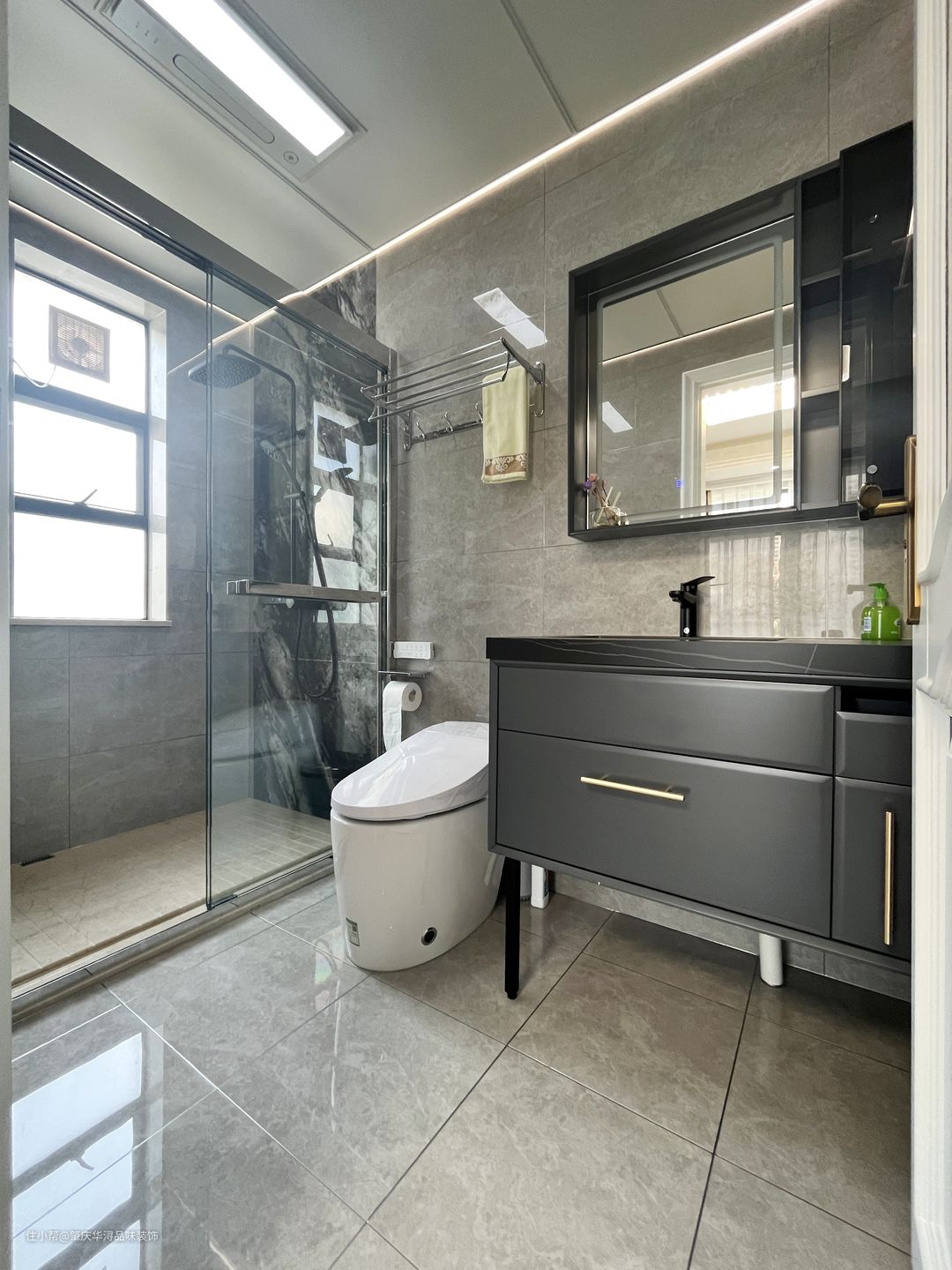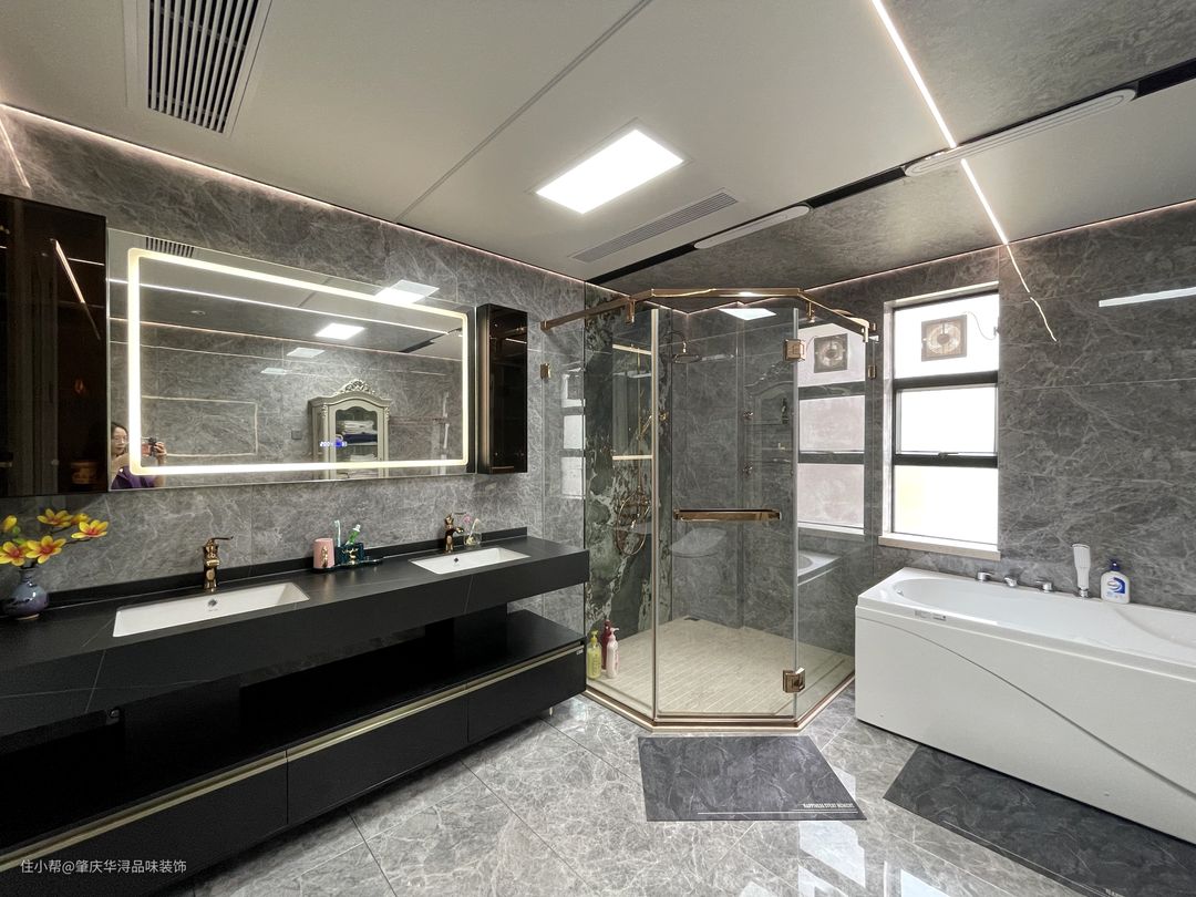 主卫简直是豪华的配置,享受型的主义。双人洗漱台配上智能镜,旁边的大浴缸洗去一天中的疲累,让身心好好地放松,套卫设计以浅灰色系为主,主打一个时尚!