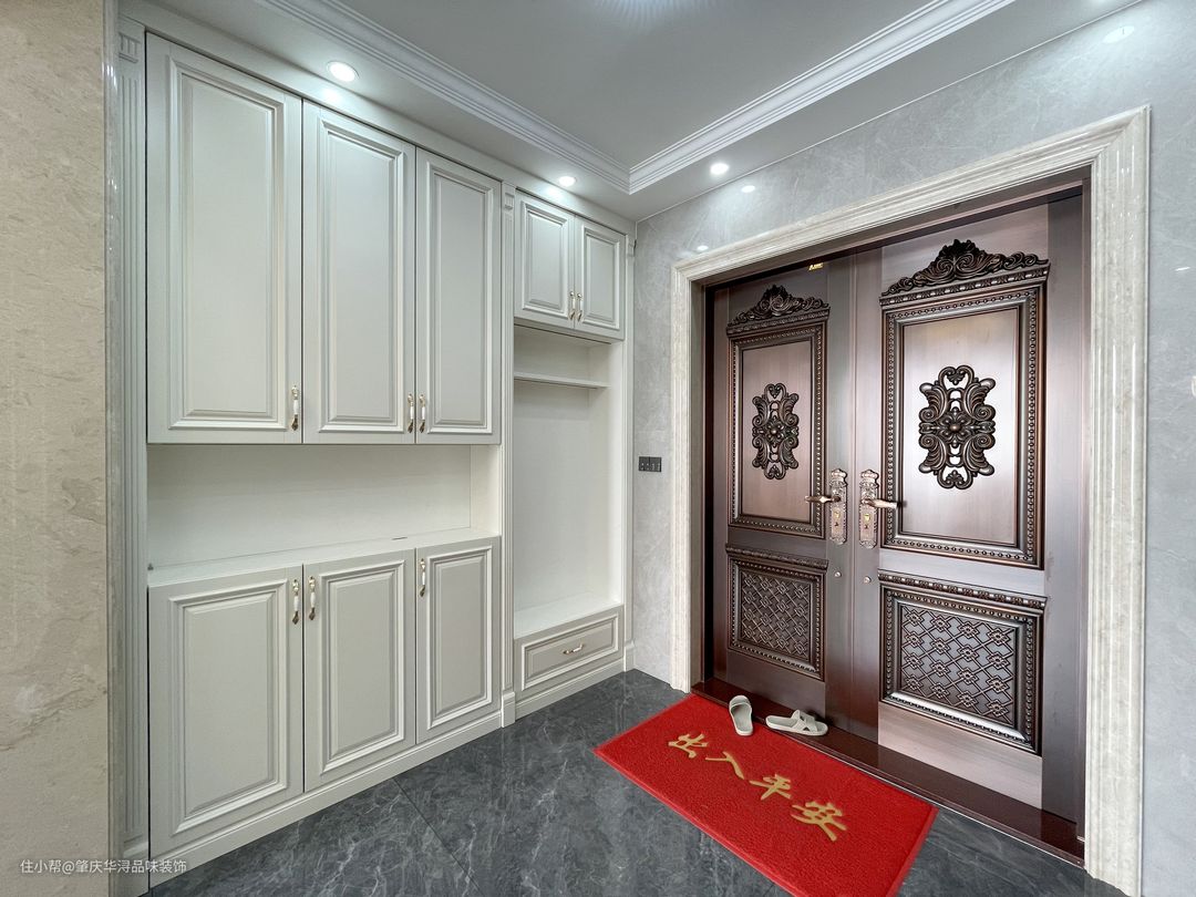 玄关位置做凹位镶入鞋柜两边搭配,欧式石膏造型悬挂壁灯高级且优雅,天花造型搭配 艺术吊灯与地面形成对应 增加浪漫精致的空间感。