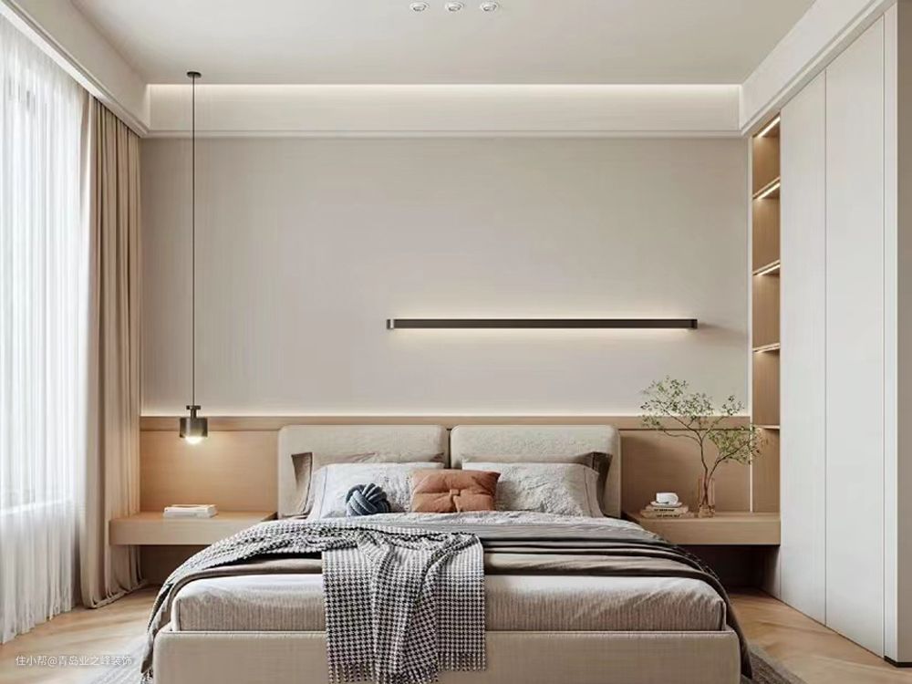 主卧:主卧通铺木质地板增加舒适性,主卧床头背景墙利用原木色给人一种慵懒的感觉。床边是简洁大气的白色衣柜,衣柜下方延伸出一个小柜子充当床头柜,不浪费每一处空间。 简约风格追求时尚潮流,合理的布局和方便的功能才能体现出他独有的情调。