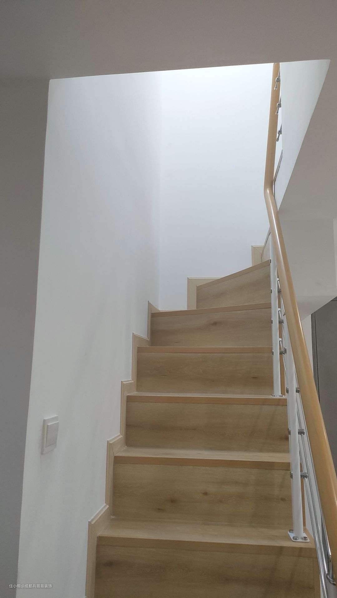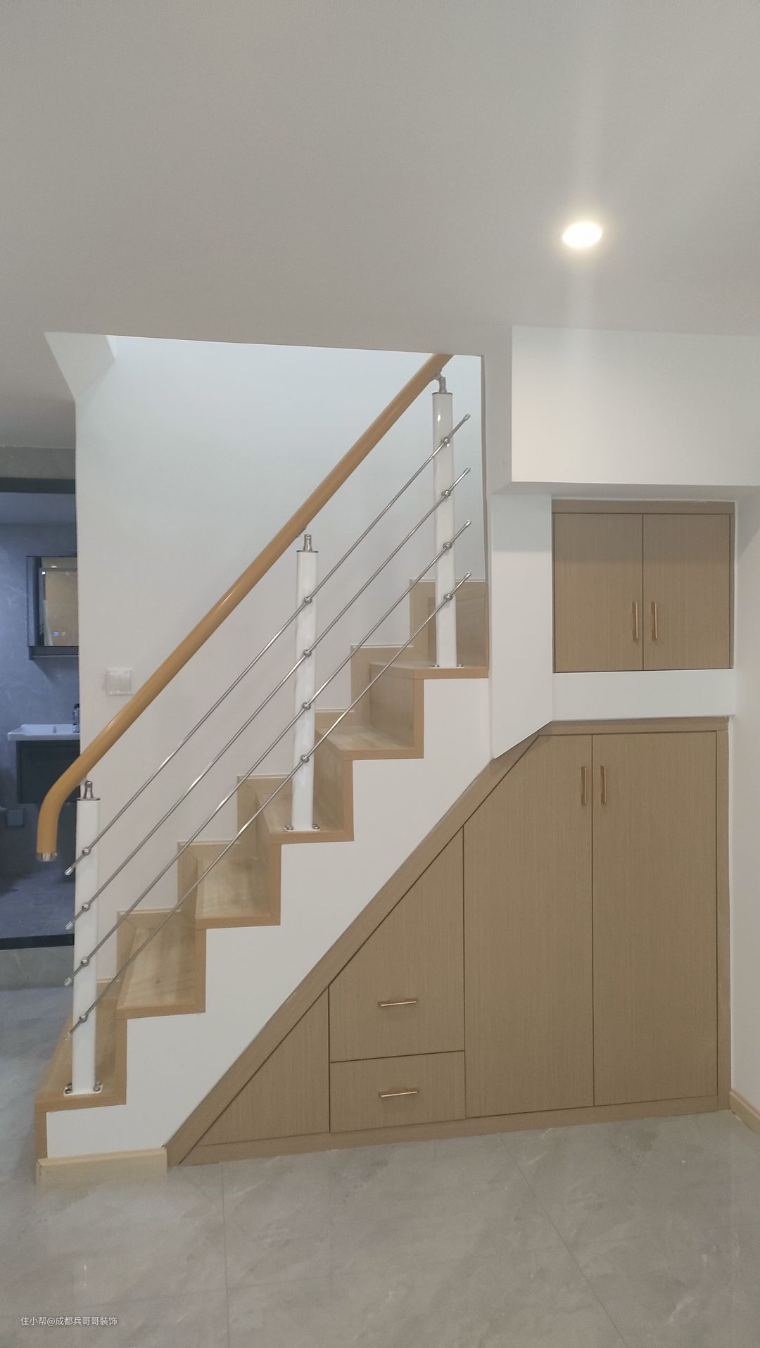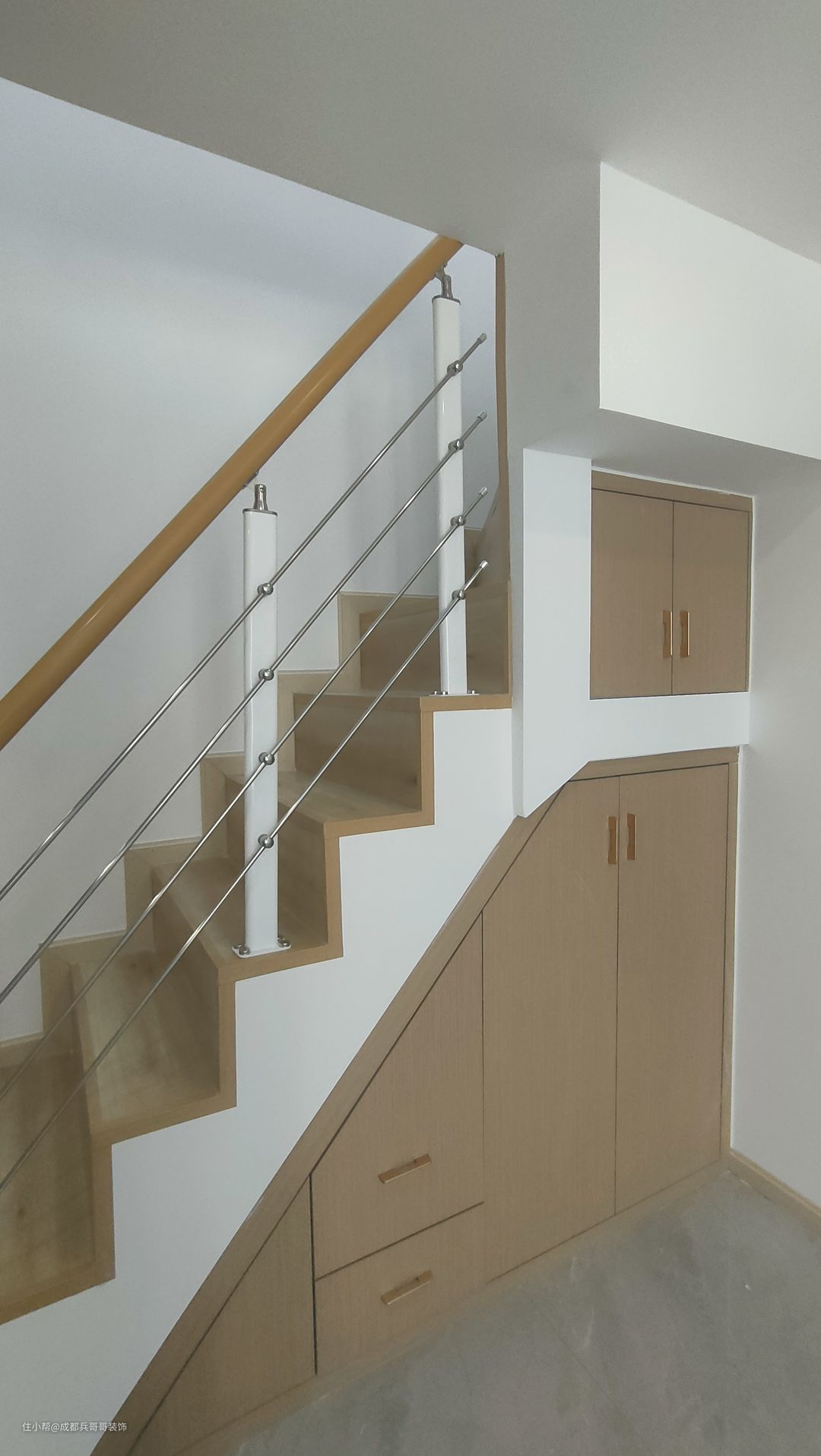 这套loft公寓楼梯是7字形钢结构楼梯搭建,木基层打底,再铺贴木地板。侧边石膏板封平,涂刷腻子、乳胶漆,扶手选用高分子扶手,经济实惠又很耐看。 公寓面积一般很有限,所以需要小空间大利用。楼梯作为一楼和二楼的衔接空间,下方空间用处很多,这套呢做了一整排储物柜,和入户鞋柜都可以一起使用,一举多得。同时也为这样的拐角户型设计解决了空间收纳的问题,你学到了吗?