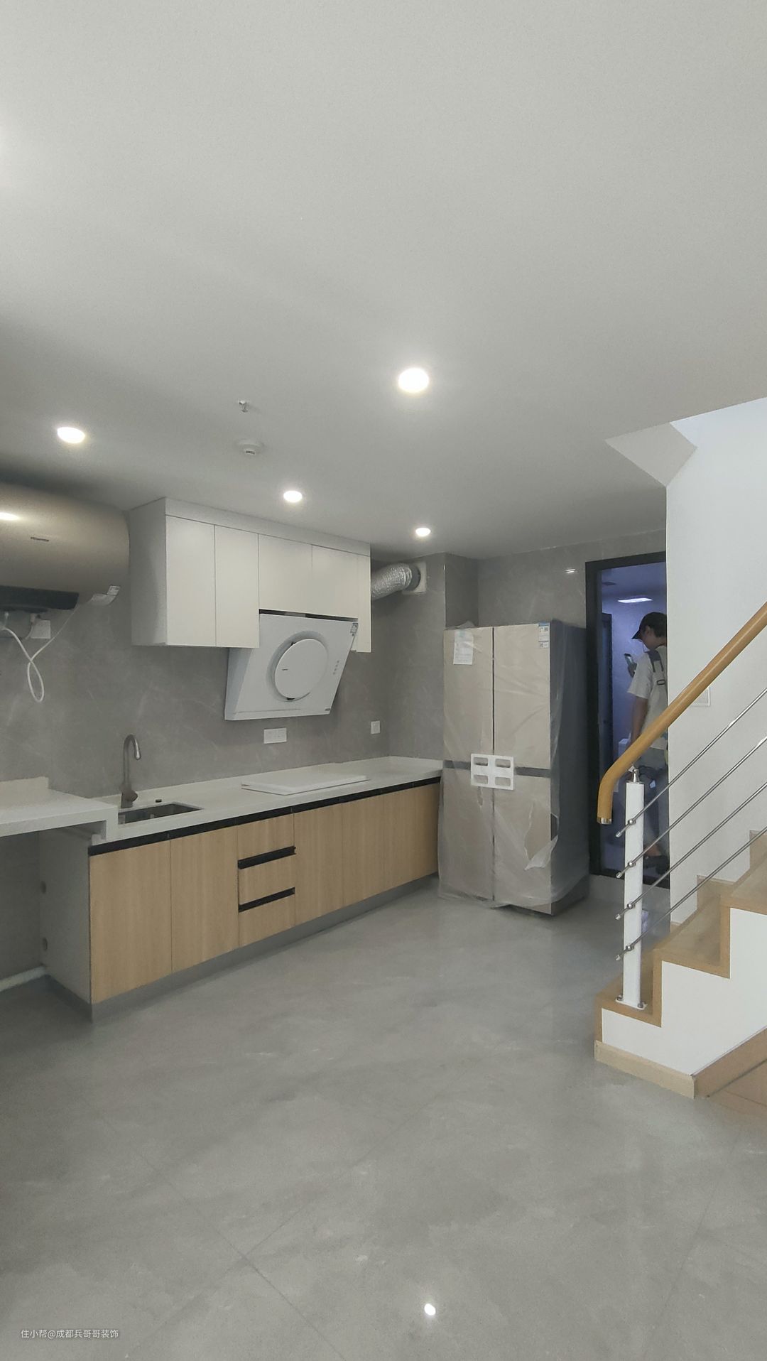 厨房,同样在一楼,开放式布局,一字形设计,一整排原木色地柜+嵌入式洗衣机+白色门板吊柜,选用侧吸式抽油烟机,右侧还放置了双开门冰箱,整个厨房不占面积,储物收纳十足~~