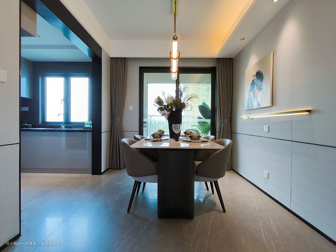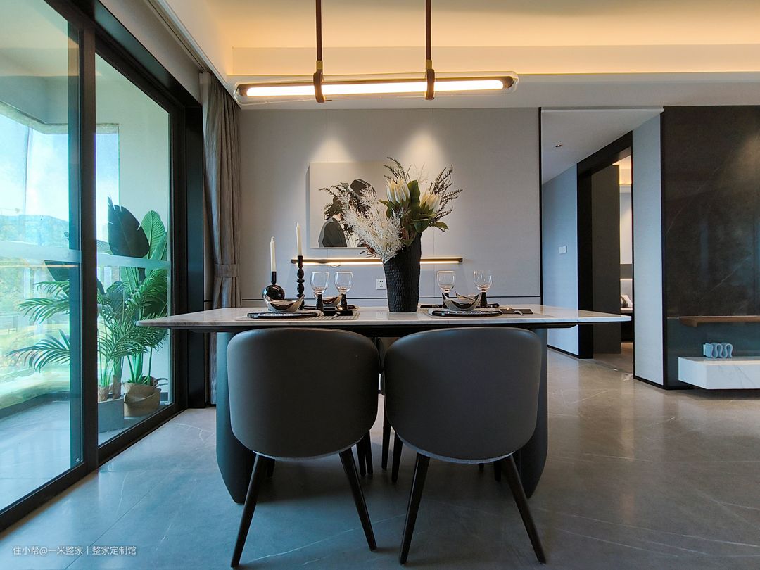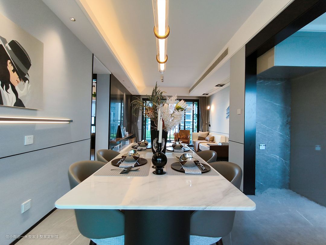 餐厅选用与客厅没有隔断的形式,让整体空间更加开阔一览无余。皮质深色桌椅的选择,保证了舒适度的同时,也避免空间过于单调。餐厅顶部铺设暖黄色灯带,让整体空间更加温馨~