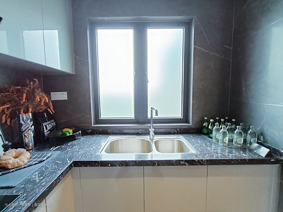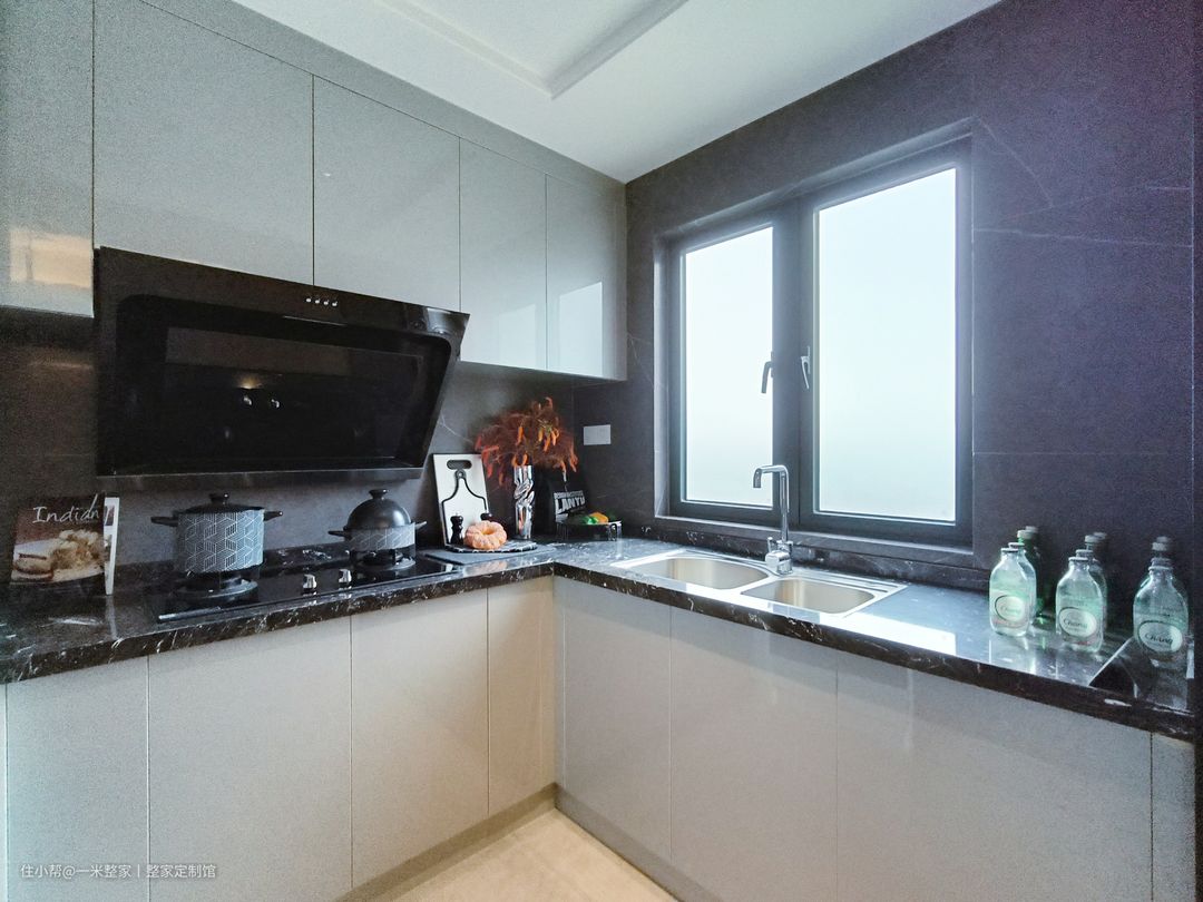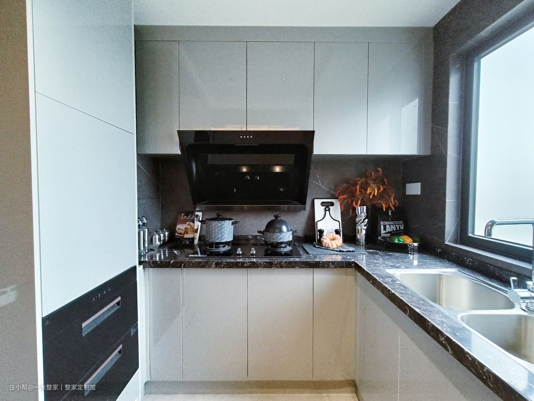 厨房采用经典的L型设计,按照洗切炒的布局进行操作,大大提升了厨房的效率,同时柜门都采用无把手的设计,保证了美观度,让整体更加和谐~厨房桌台下面全都设计为柜子,也很方便取物。