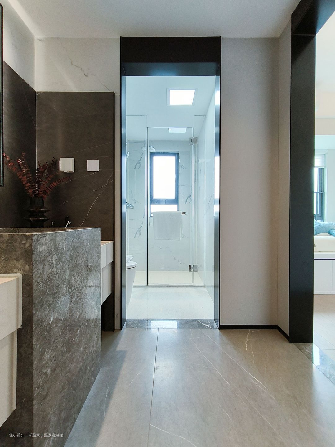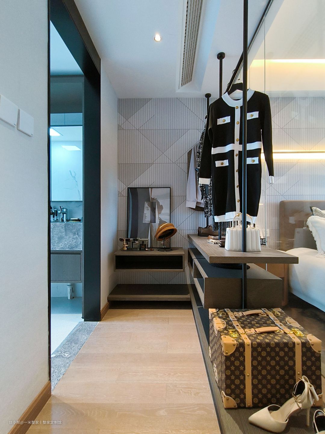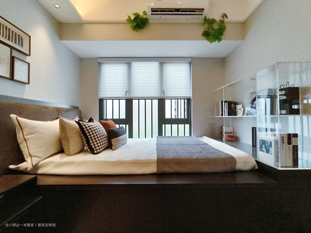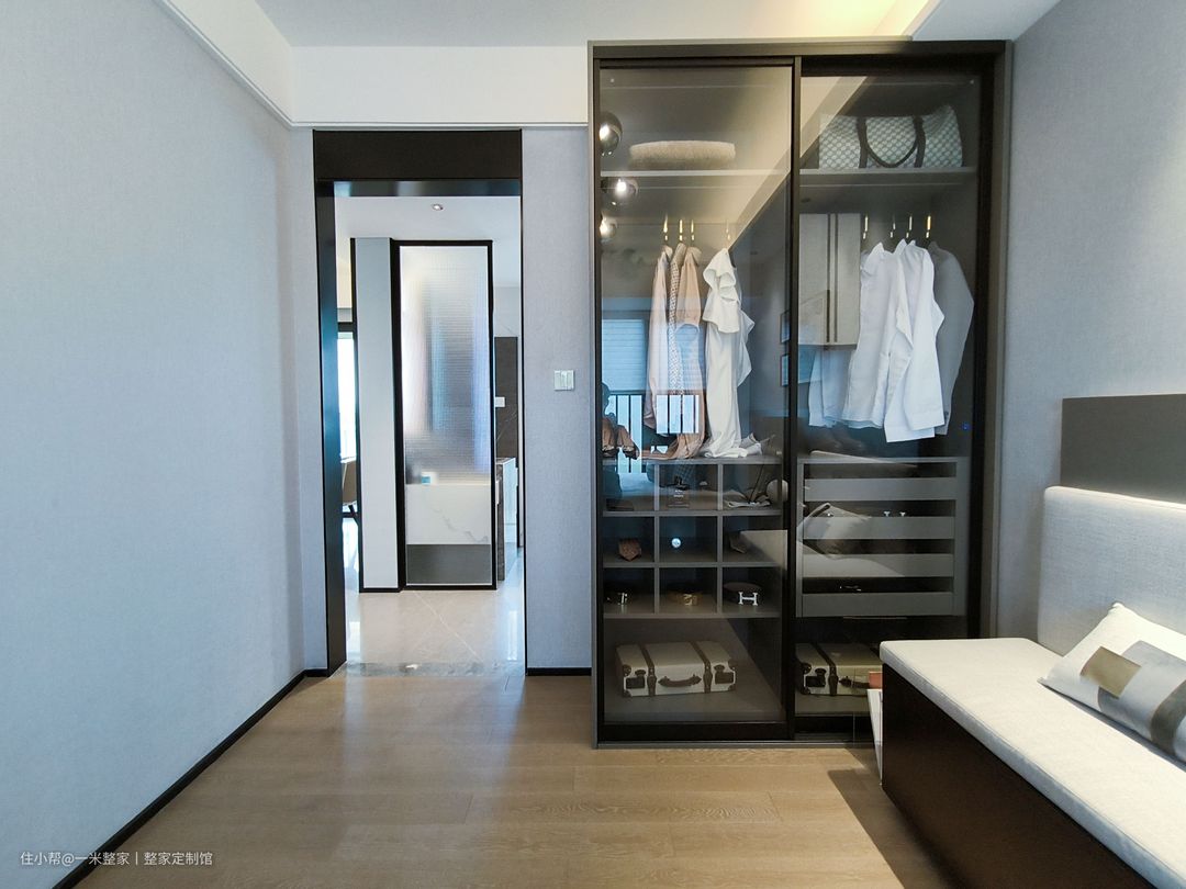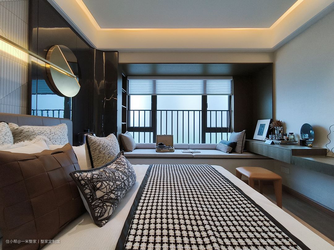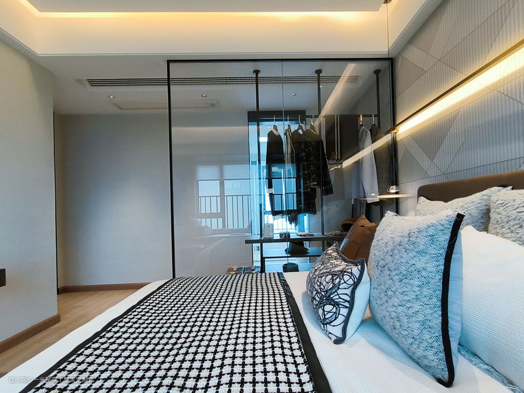 主卧主体是黑白灰色调,四周小射灯的暖光照射下来,很有氛围感。将床铺垫高与窗户齐平,下方的变为储物格,大大增加了储物空间。同时靠近窗边,窗外美景一览无余,透明展示柜的设计,方便展示和拿取,放在床尾也大大便利了随手阅读。 搭配简约的家具和线条流畅的设计,营造出舒适宜人的休憩空间。用透黑色隔板隔开居住区为主人设计衣帽间,也充分利用了室内空间。