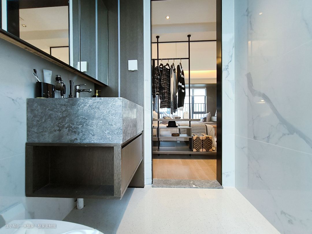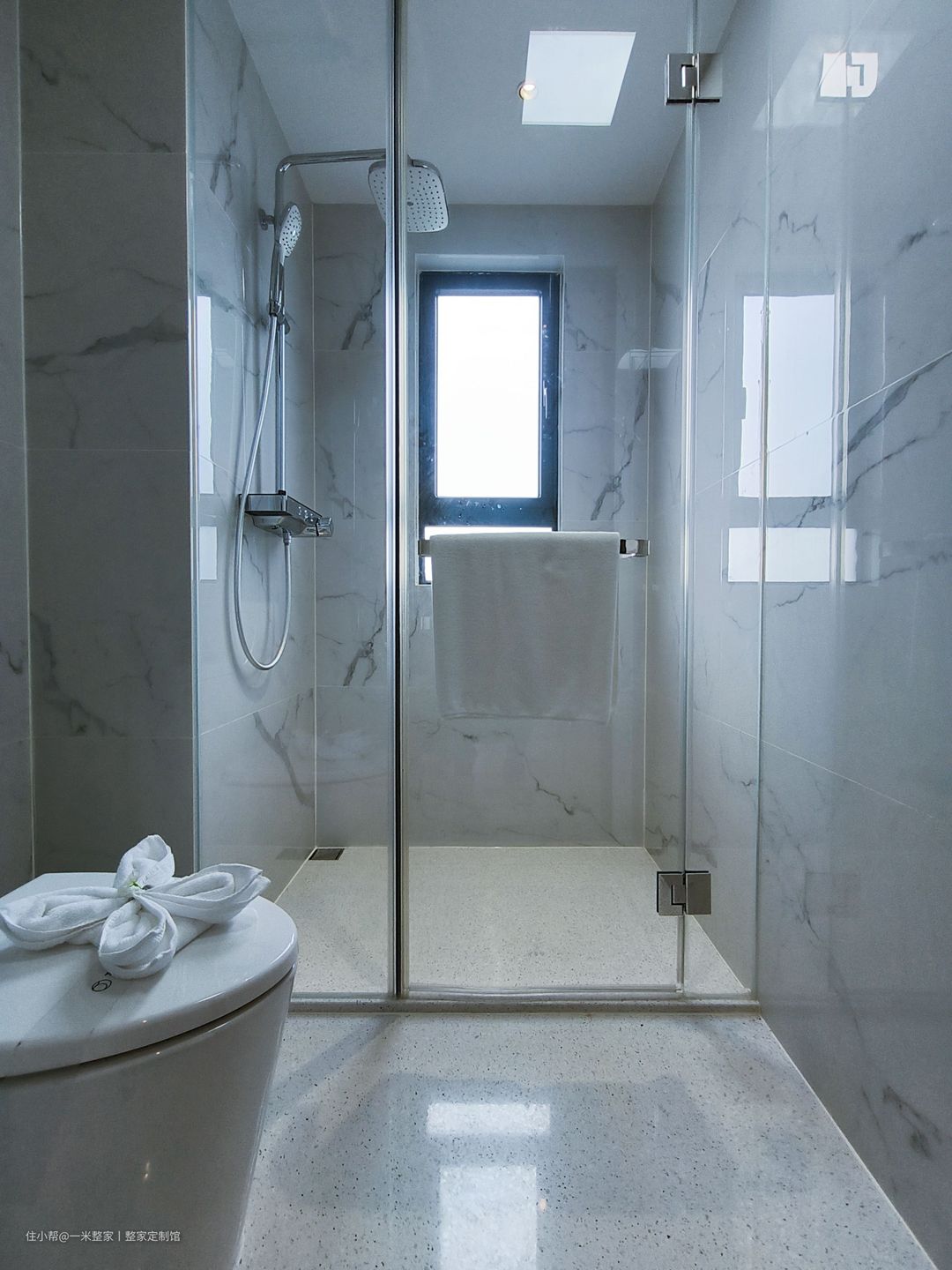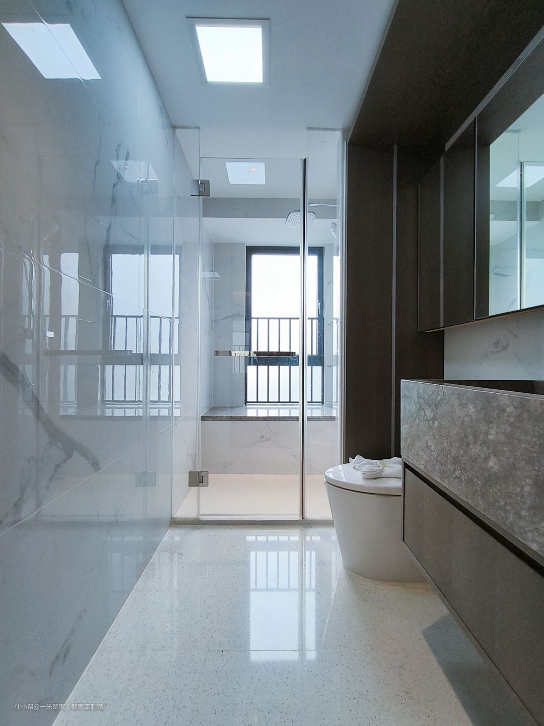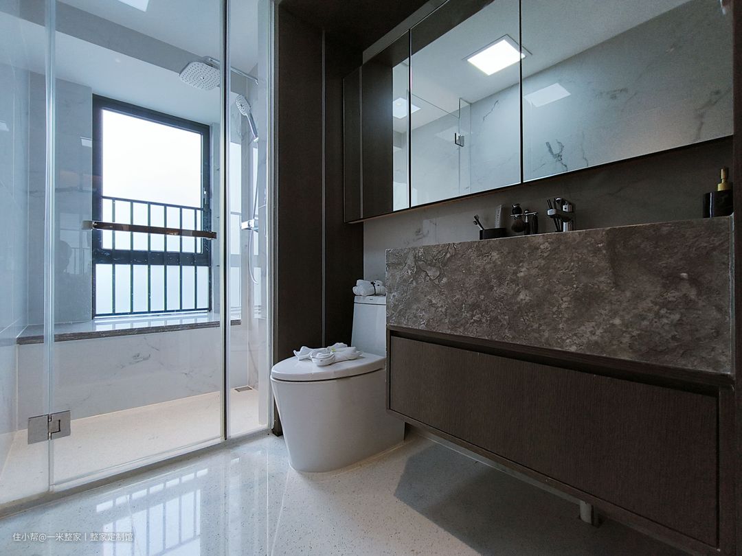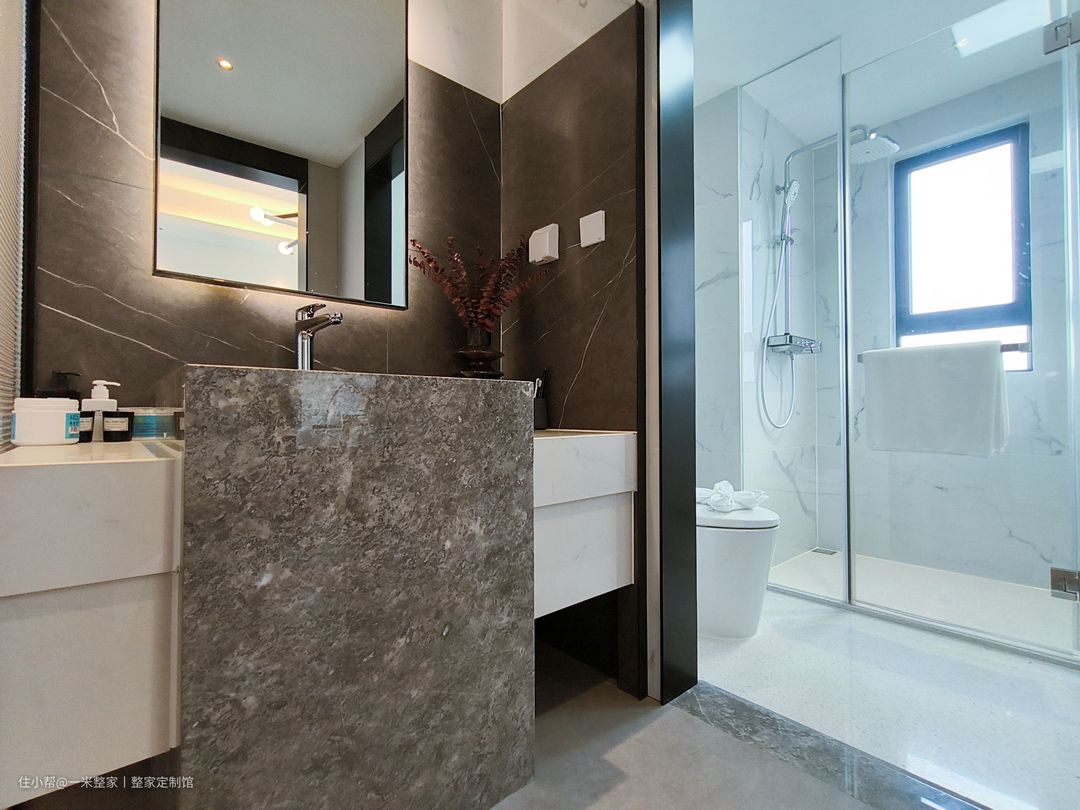 卫生间采用干湿分离的方式,保证了干净卫生,洗漱台采用简约设计,大理石材料的选择,方便清洁整理,设计镜后空间,合理的利用了空间~