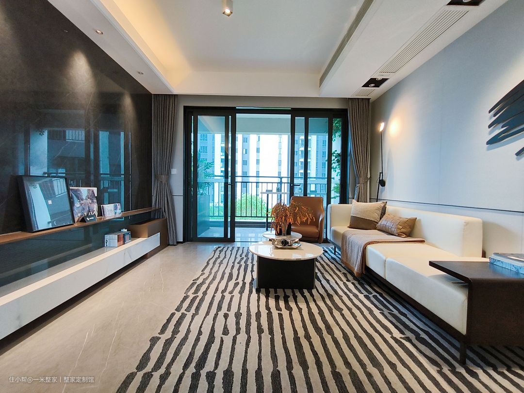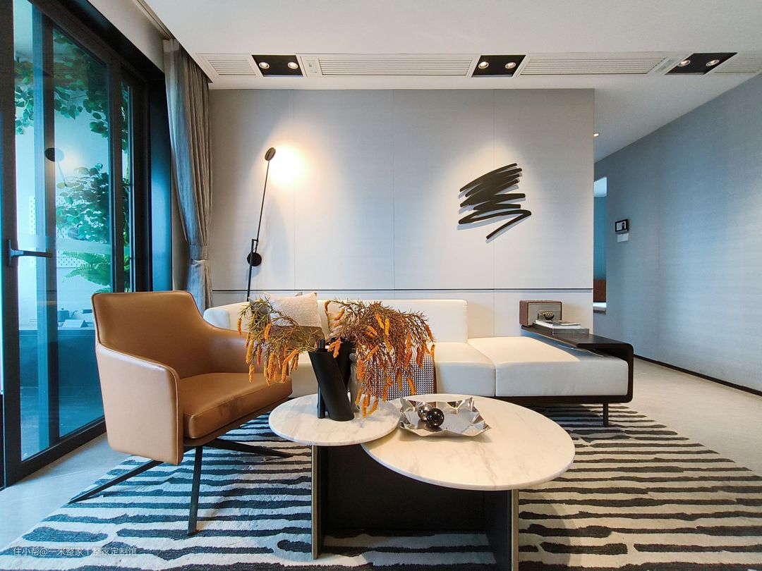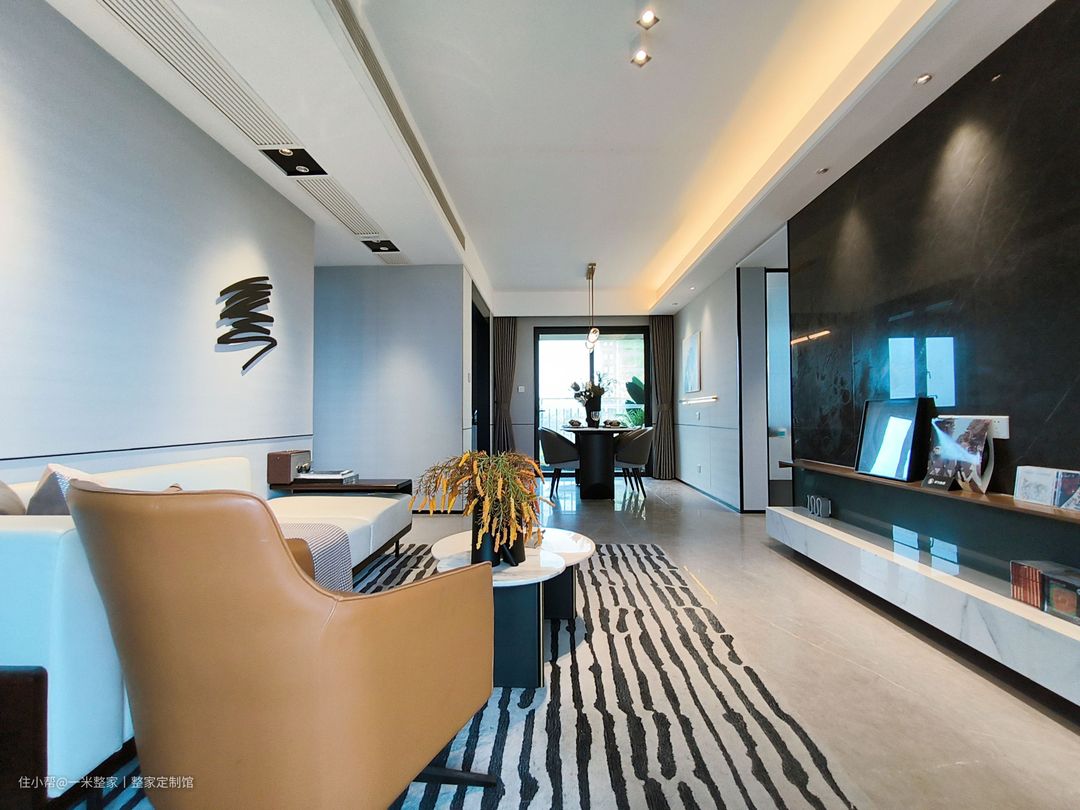 客厅以黑白色系为主,电视背景墙选用纯黑色,沙发背景墙选用纯白色,两边互相对比形成反差感。同时地毯选用黑白相间图案,起到了一个层层递进的过渡作用黑白色调既能提供稳定和平静的感觉,又能为空间增添一份优雅和现代感。整体采用干净利落的线条,降低客厅空间的冗杂感~搭配简约的家具,如白色布艺沙发、大理石茶几、边几和等,以保持整体风格的统一性。