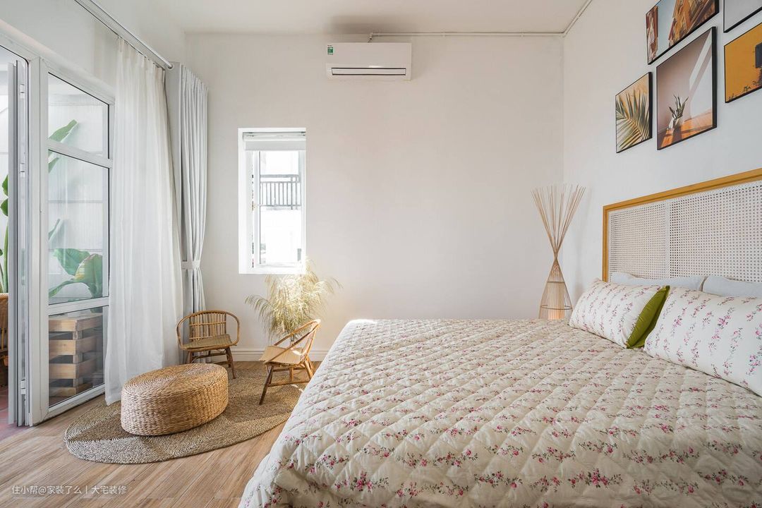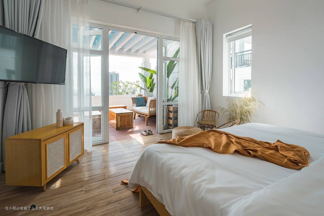 房间主卧带有一个露天大阳台,夫妻俩喜欢接触大自然,因此我们加了一个透明的折叠门,遮风挡雨的同时,在卧室也能轻松欣赏自然风光,整体以白色为主,房内有一张床和一台电视,电视柜是木制的,房间内还放置了多个装饰品,如花瓶、雕塑等。阳台上可以看到植物,还有椅子和咖啡桌,整体围绕着原木风展开,暖色系的装修风格,暖暖的。