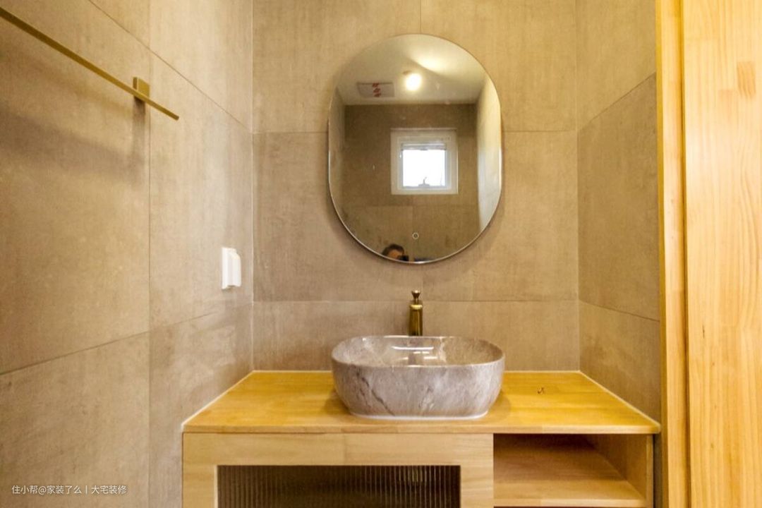 洗手盆是由石头制成的,质感粗糙而坚硬,与镜子形成了强烈的对比。这种材质的运用也增添了整个空间的现代感。镜子是圆形的,采用现代简洁的线条设计,给人一种时尚而简约的感觉。同时,镜子周围没有任何多余的装饰,也体现了现代风格的简约特点。