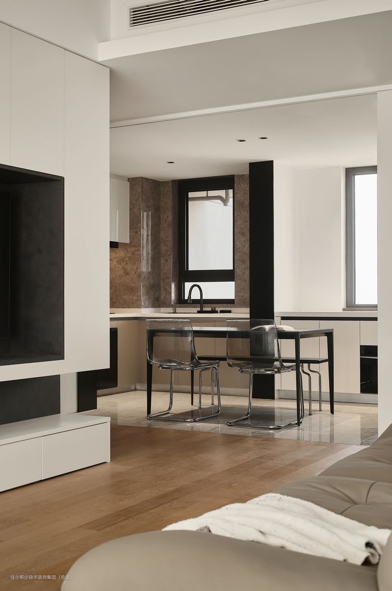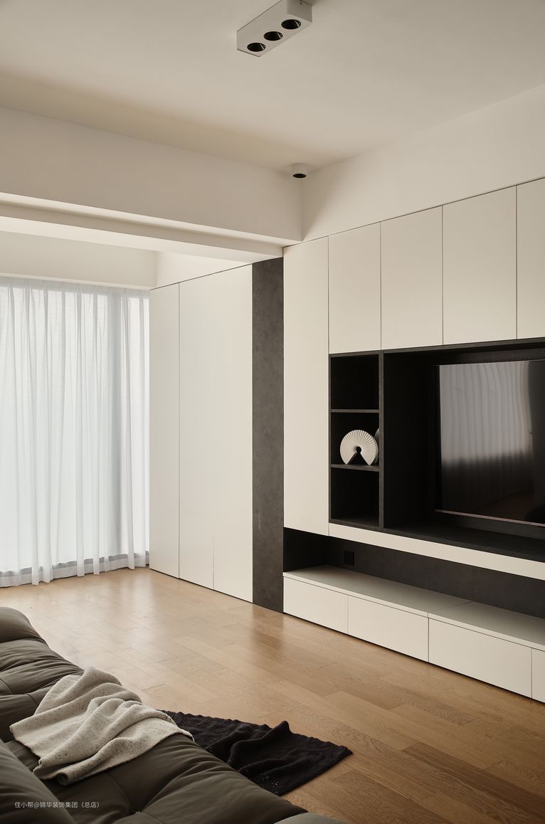 本案是一套116平三室两厅一厨两卫的精装修改造设计,男女主人平时工作闲暇之余喜欢居家生活,陪伴小孩,享受家的温馨与安逸。因此整体风格设计选择现代简约风,白色做主基调,黑色和原木色搭配点缀,使空间明亮舒适,墙面米咖色,冷暖调配让整个空间呈现出简洁、安静、素雅的感觉。