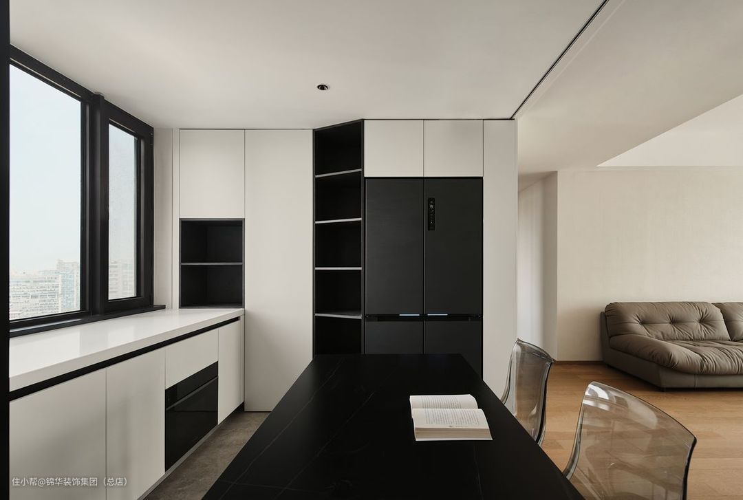 餐厨一体化,增加吧台和餐边柜,同时零嵌冰箱的融入,使整个利用空间大大提升也更显通透。