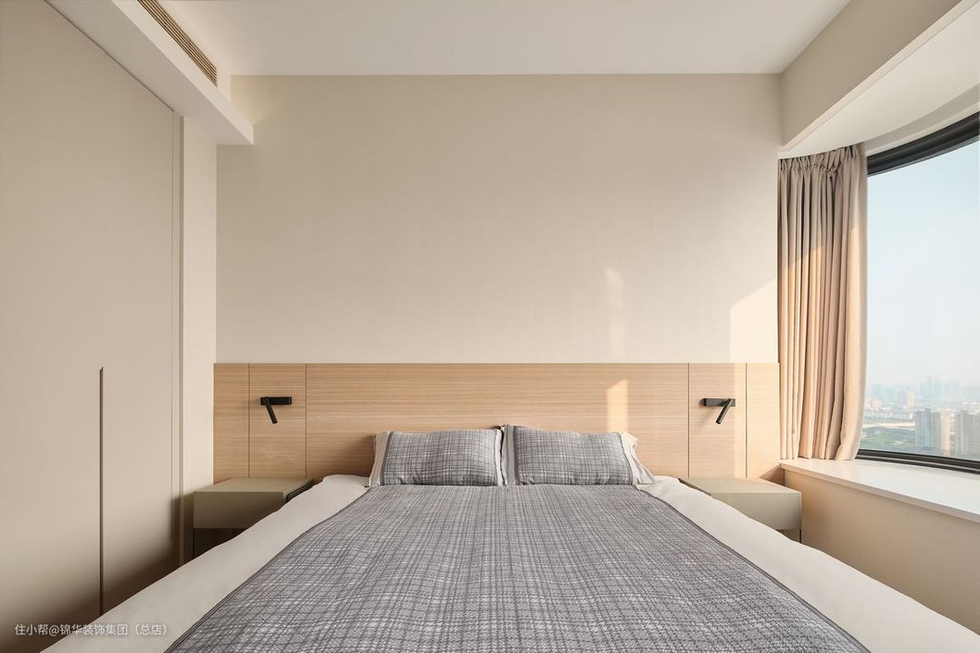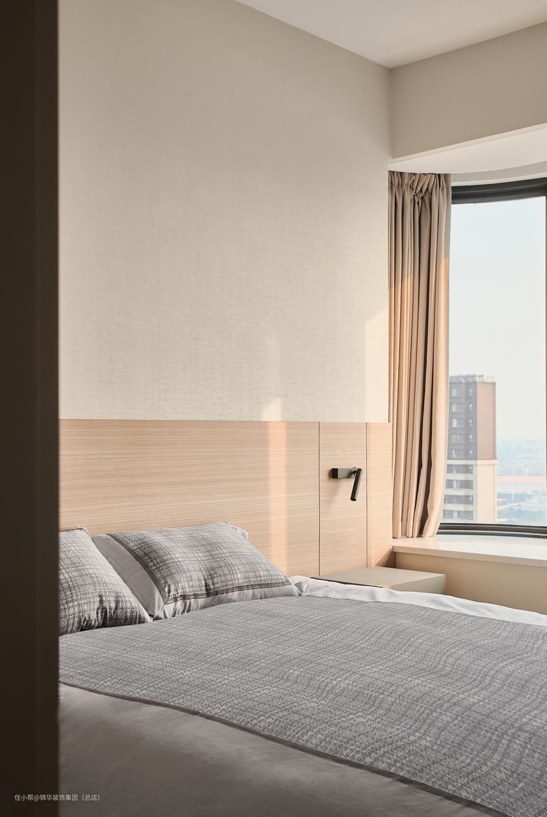 原木色半高护墙内嵌灯带设计,搭配原始地板和木门,配上奶咖色布艺窗帘,使整个空间更加柔和舒适。黑色简约壁灯和护墙灯带,满足业主不同场景灯光使用需求。