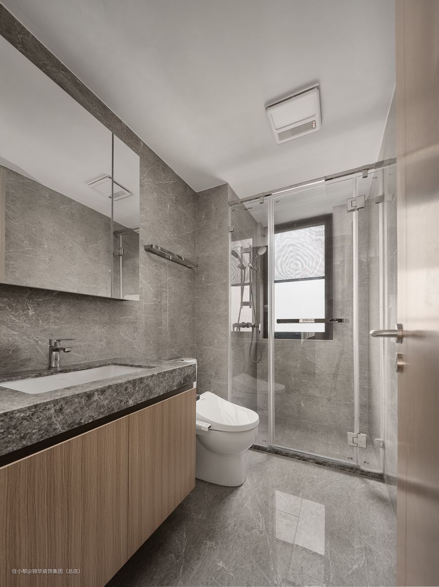 一字型布局,空间最大化利用。墙地一体灰色瓷砖搭配石膏板吊顶,更显简洁。石材台面和台下盆,美观又好打理卫生。