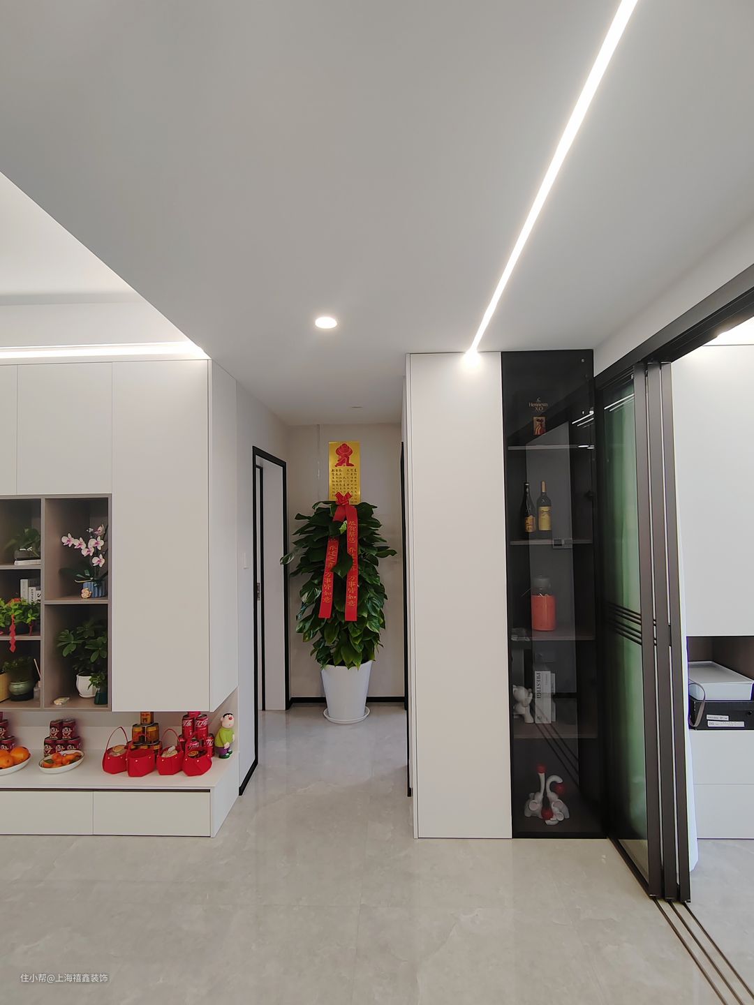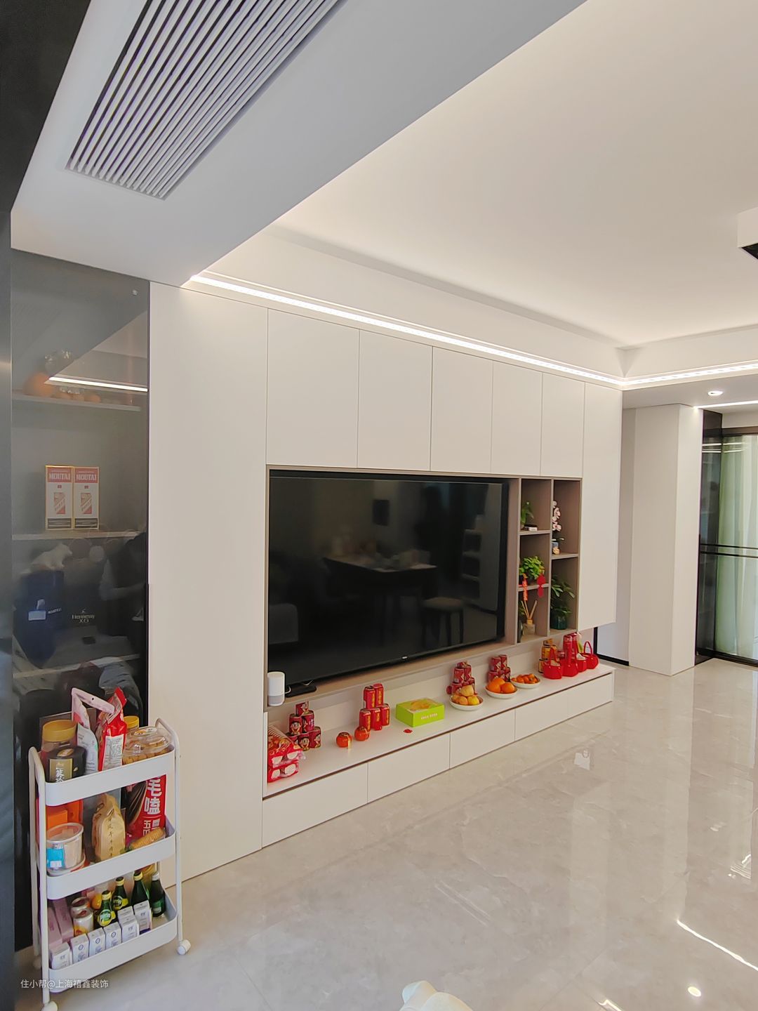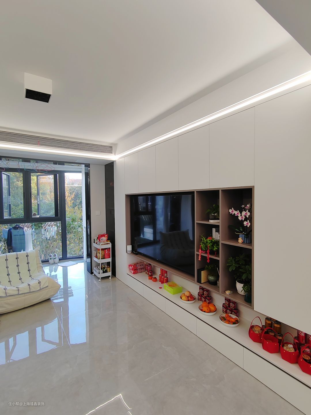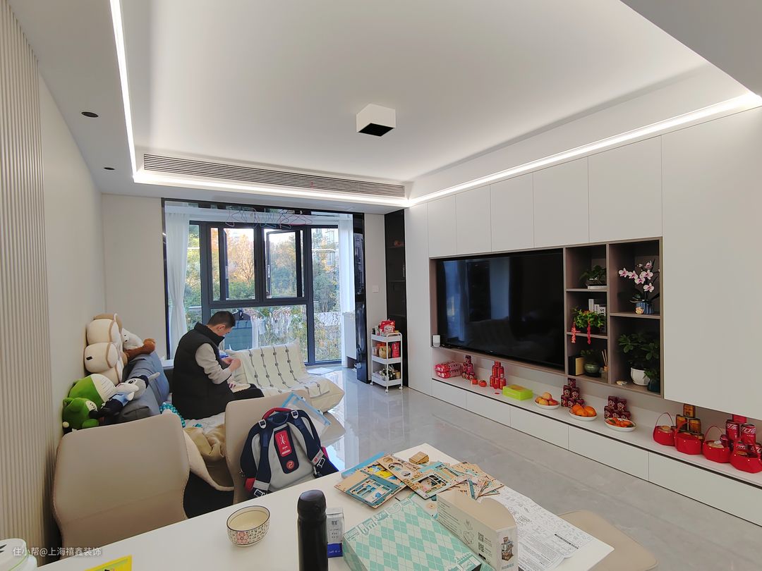 整个客厅以白色为主色调,显得干净而明亮。白色的墙面搭配白色的储物柜背景墙,不仅增加了空间的收纳能力,还让整个空间更加统一和整洁。在客厅的中心位置,放置了一张灰色的沙发,软硬适中,坐起来非常舒适。沙发的颜色与背景墙形成了对比,为整个空间增添了一份层次感和时尚感。