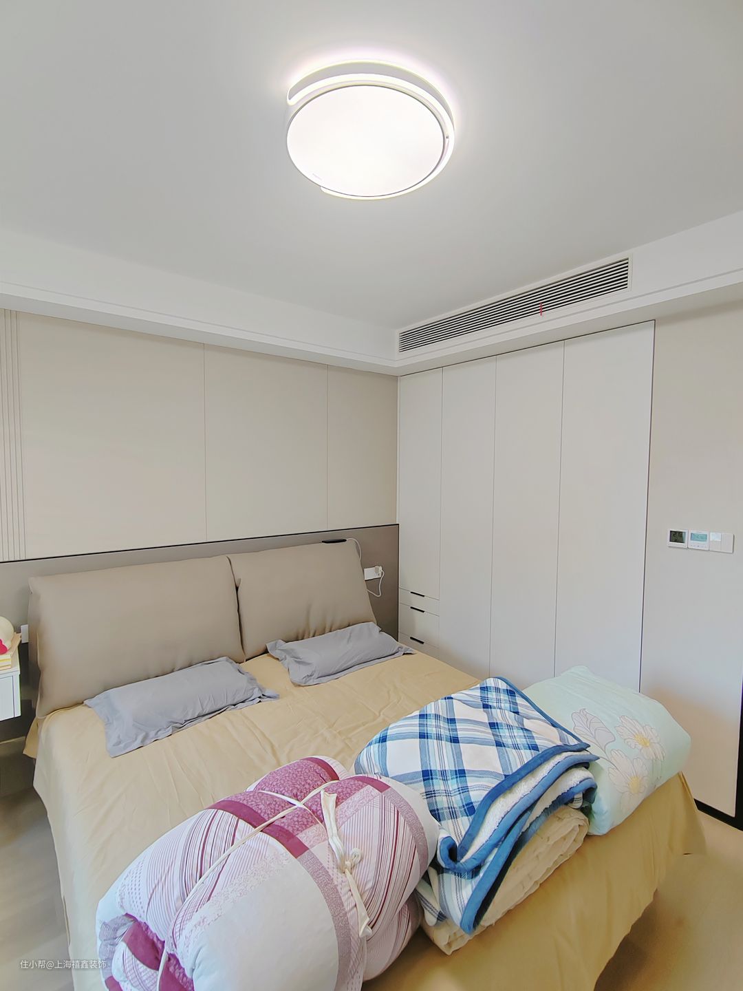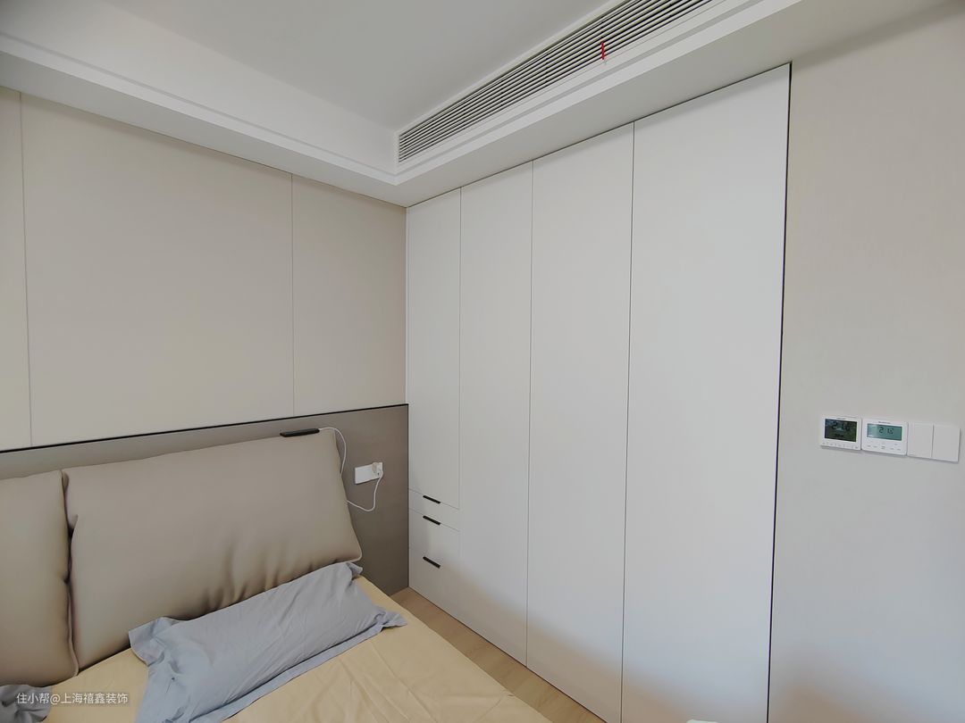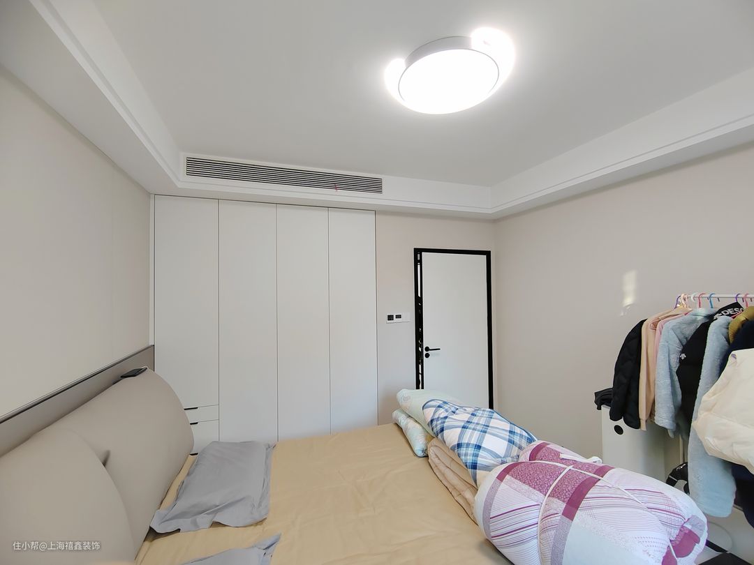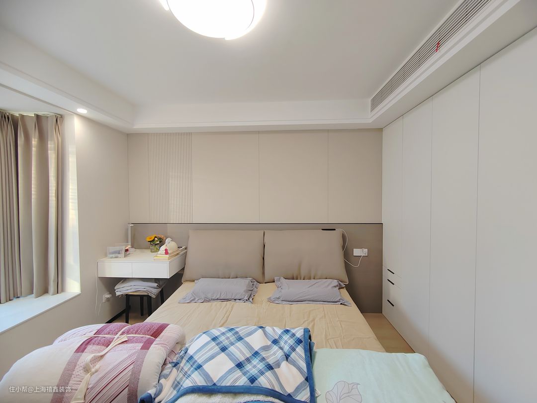 这个主卧给人一种温馨舒适的感觉。透过飘窗,阳光洒进房间,暖黄色的窗帘在阳光的映衬下显得格外柔和。整个房间的墙面也是暖色的,让人感到一种温暖和安逸。房间内定制了嵌入式白色的衣柜,整洁而大气。衣柜的细节处理得非常精致,给人一种高品质的感觉。整个房间的氛围非常轻松愉快,让人感到无比舒适。无论是休息还是放松,这个主卧都能提供给你一个温馨舒适的环境。