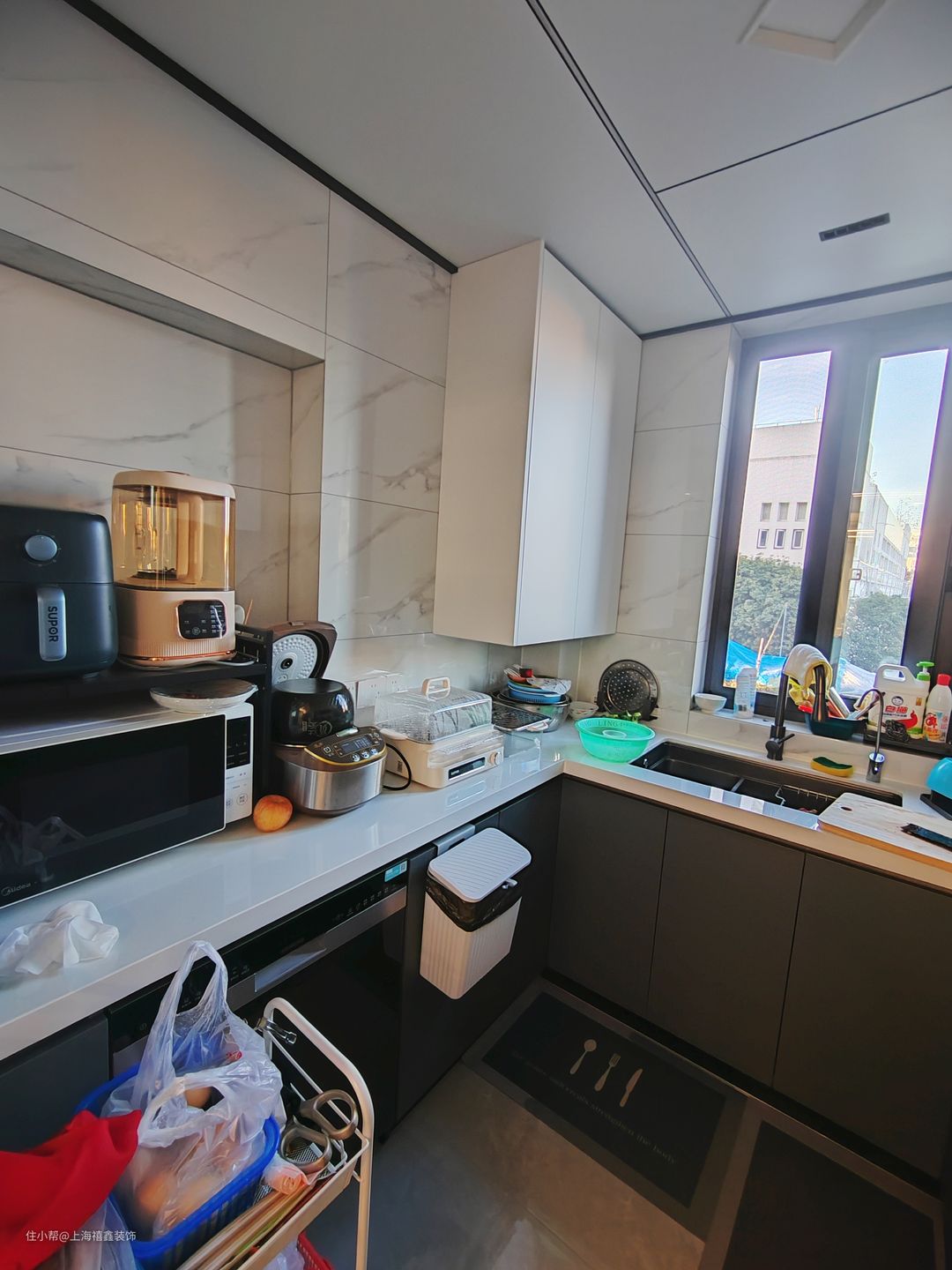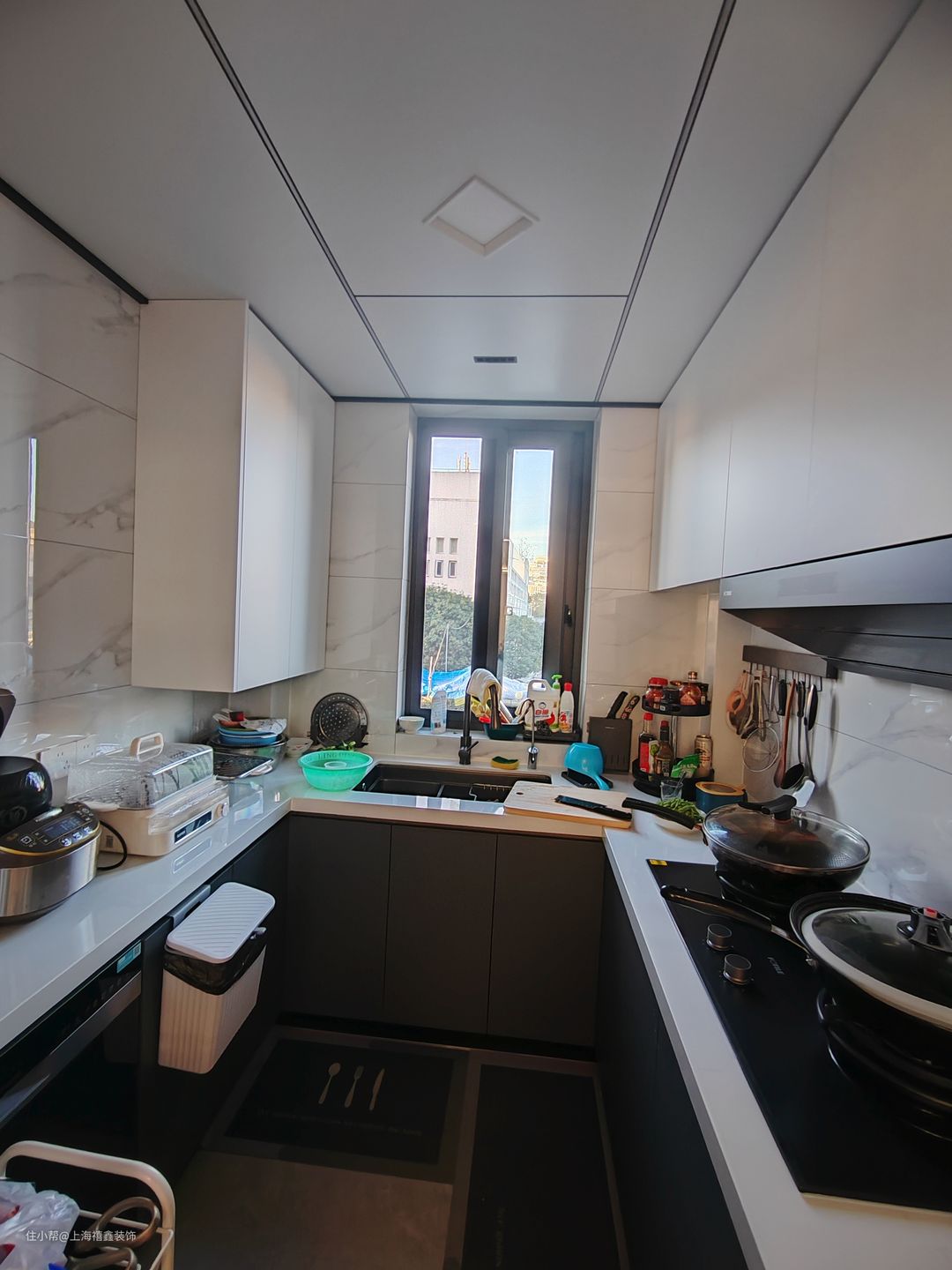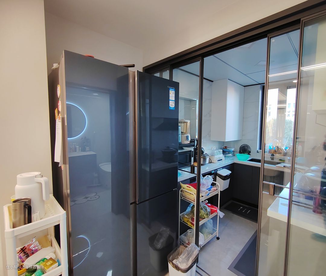 厨房采用了U型设计,充满了实用性和便利性。玻璃推拉门让厨房充满了明亮的光线,同时又阻断了油烟进入客厅。吊柜设计增加了储物空间,让厨房看起来更加整洁和有序。整个厨房的材质和色彩搭配都非常和谐,给人一种舒适的感觉。无论是烹饪还是休闲,这个厨房都为你提供了一个完美的空间。