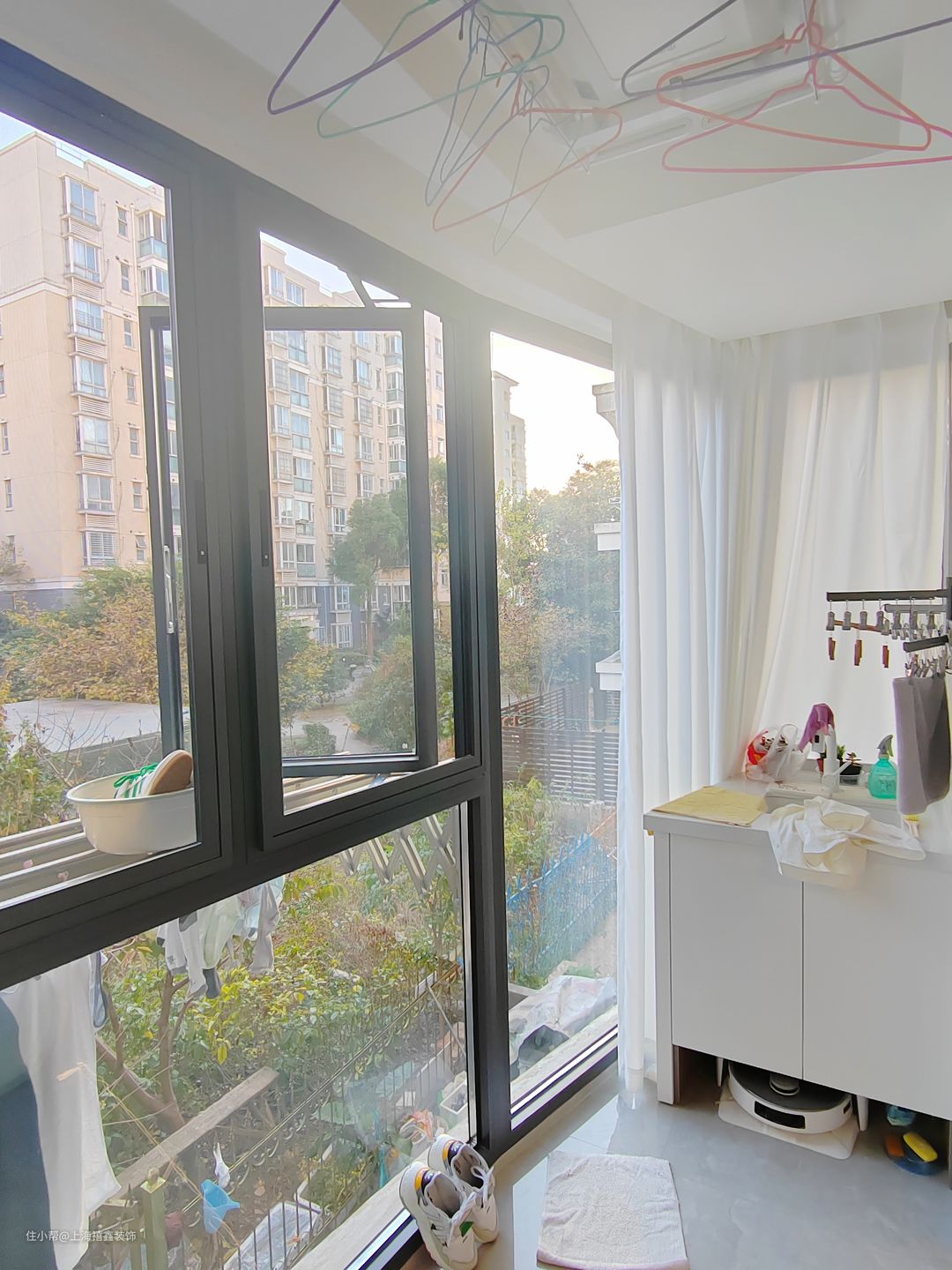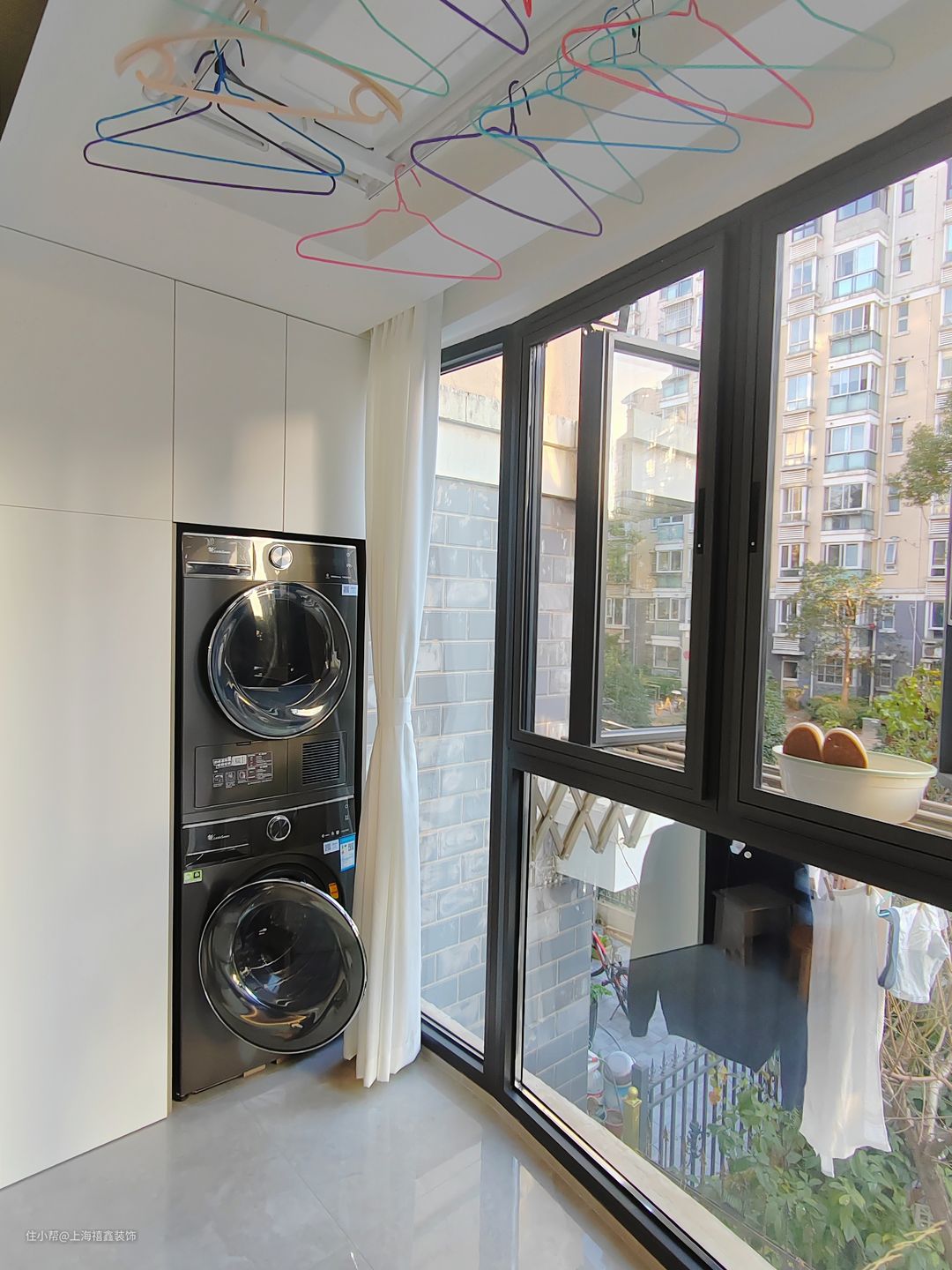 这个阳台设计得非常实用,设有一个洗烘一体机,可以更方便地清洗和烘干衣物,同时还能节省空间。旁边是一个储物柜,可以方便存放清洁用品和杂物,让整个阳台看起来更加整洁。整个阳台的设计风格简约大方,让人感觉非常舒适。