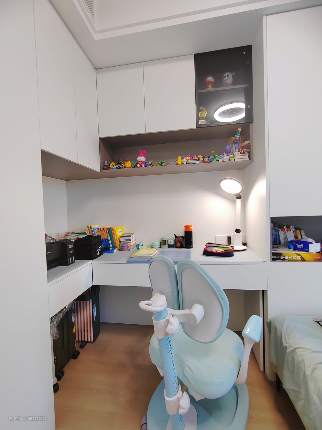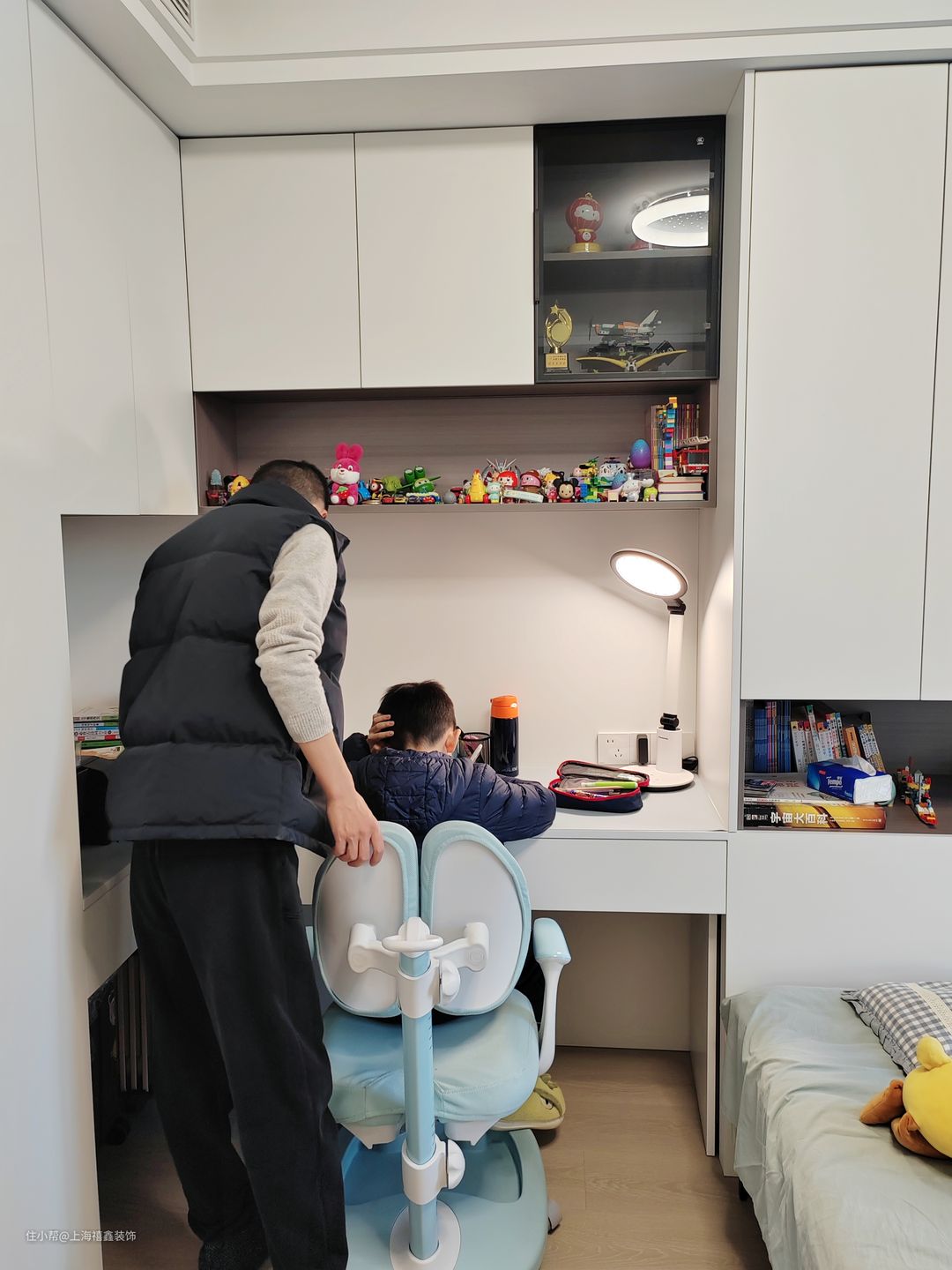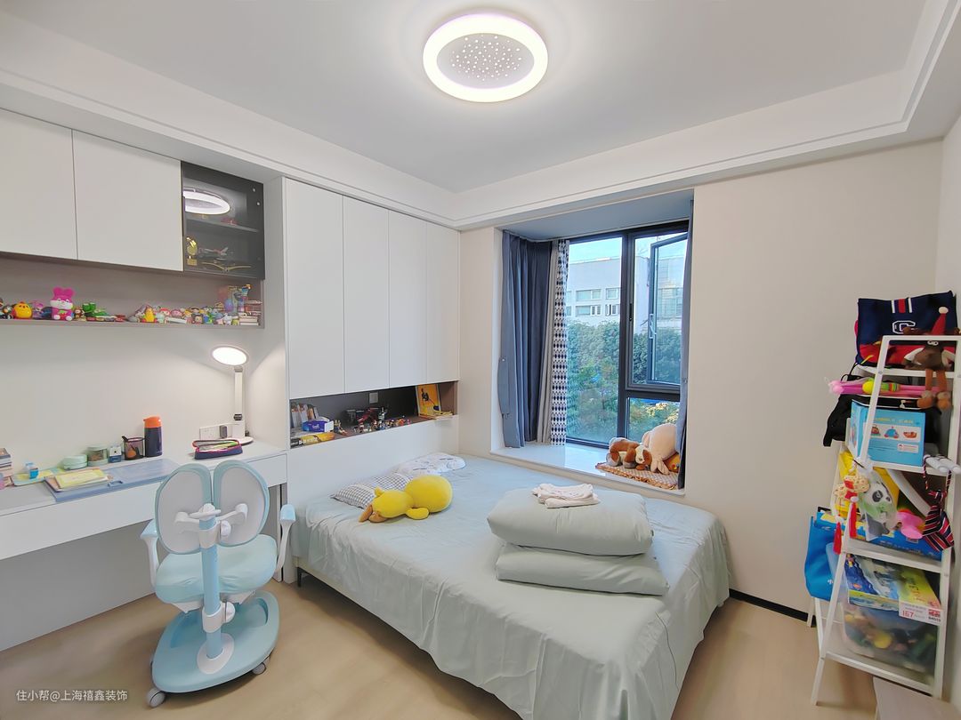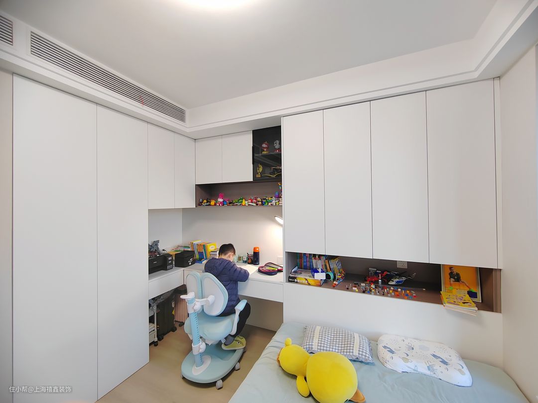 儿童房设计得非常实用和舒适,房间的整体色调为白色,显得干净而明亮。光线充足的窗户让整个房间非常明亮,孩子们可以在这里愉快地学习和玩耍。房间内定制了双面墙白色储物柜,外观美观大方,内部空间也很大,可以容纳孩子的衣物和玩具等物品。榻榻米的设计不仅增加了储物功能,而且节省了空间,让孩子们的物品整齐有序地摆放。为孩子创造了一个愉快、舒适的学习和休息空间。