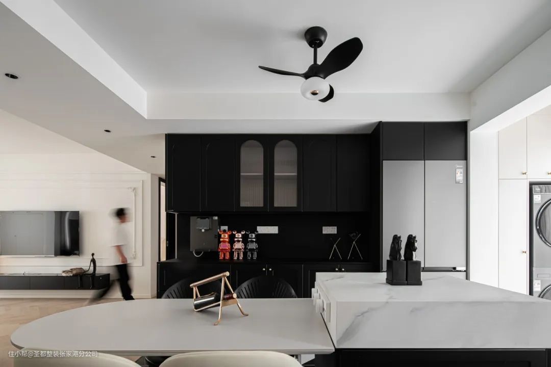 餐厅紧邻客厅而立,采用大理石餐桌+岩板岛台的高低差设计,开放式的厨房让空间变得更通透明亮。除了台面上有电器摆放的位置,还做了内嵌的柜子收纳电器,让厨房变得更整洁明亮。 餐厅地面用黑白瓷砖铺贴出菱形棋格,混搭复古靠椅,让人感觉仿佛置身于西方宫廷之中。搭配许多别有风情的餐具和小装饰,让整个餐厅更加有情调。