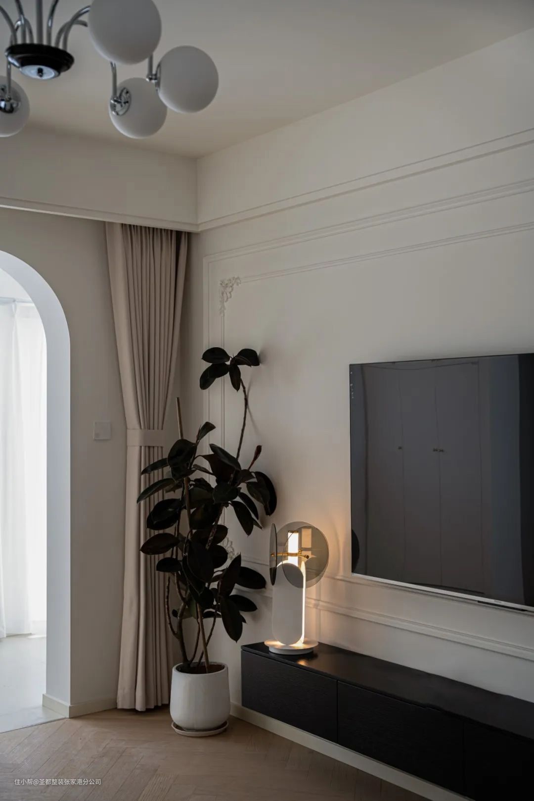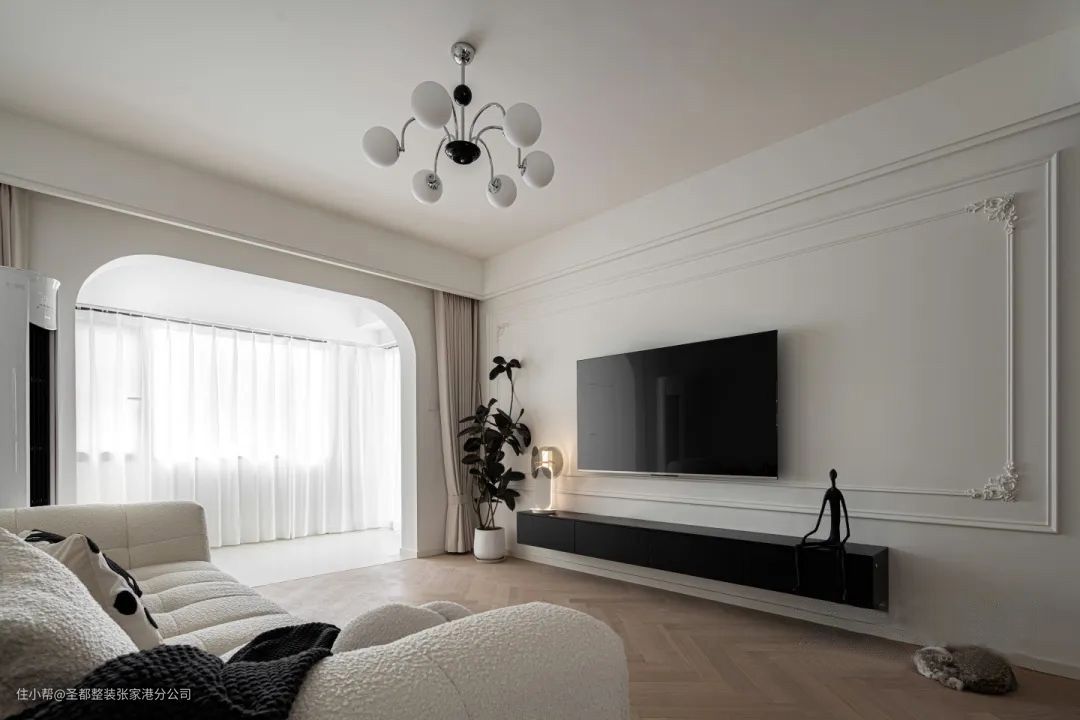 进入室内,法式风情精致优雅的气息扑面而来,从顶面到墙面线条流畅造型精美,精致的复古吊灯更显法式风情,温暖的奶油色系配色营造出平静温和的氛围。 客厅,作为家庭生活的主要活动场所,要设计得尽可能温馨舒适,以复古法式为设计基准加入奶油风,便是这套家居的底色。客厅地面采用了通铺的木地板,与阳台相通,采光十分充足。落地窗设计更是让阳光洒满 整个空间。 簇绒沙发亲肤舒适,黑白撞色靠垫打破白色的一成不变,在原木地板的映衬中,慵懒而舒适。 电视背景墙和沙发背景墙造型简洁,利用线条将各个区域连接起来,鱼骨拼木地板让人眼前一亮,空间动线十分合理,开放式布局则让各个空间的连接更为流畅。