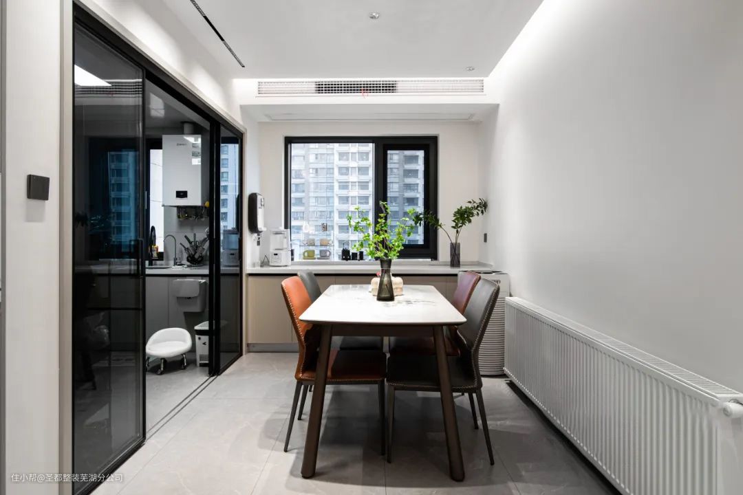 餐厅与厨房之间使用玻璃推拉门隔断,岩板餐桌搭配皮质的餐椅,温馨又舒适。透过窗户,让光线引入空间又保持了空间的私密性。靠窗定制一个餐边柜,摆上绿植,水具,也是显得格外的清新自然。 家的温暖,是慢慢渗透生活的放松感,在这样的空间里吃饭,相聚,生活,家常小菜也是山珍海味,心也不自觉的变得柔软。