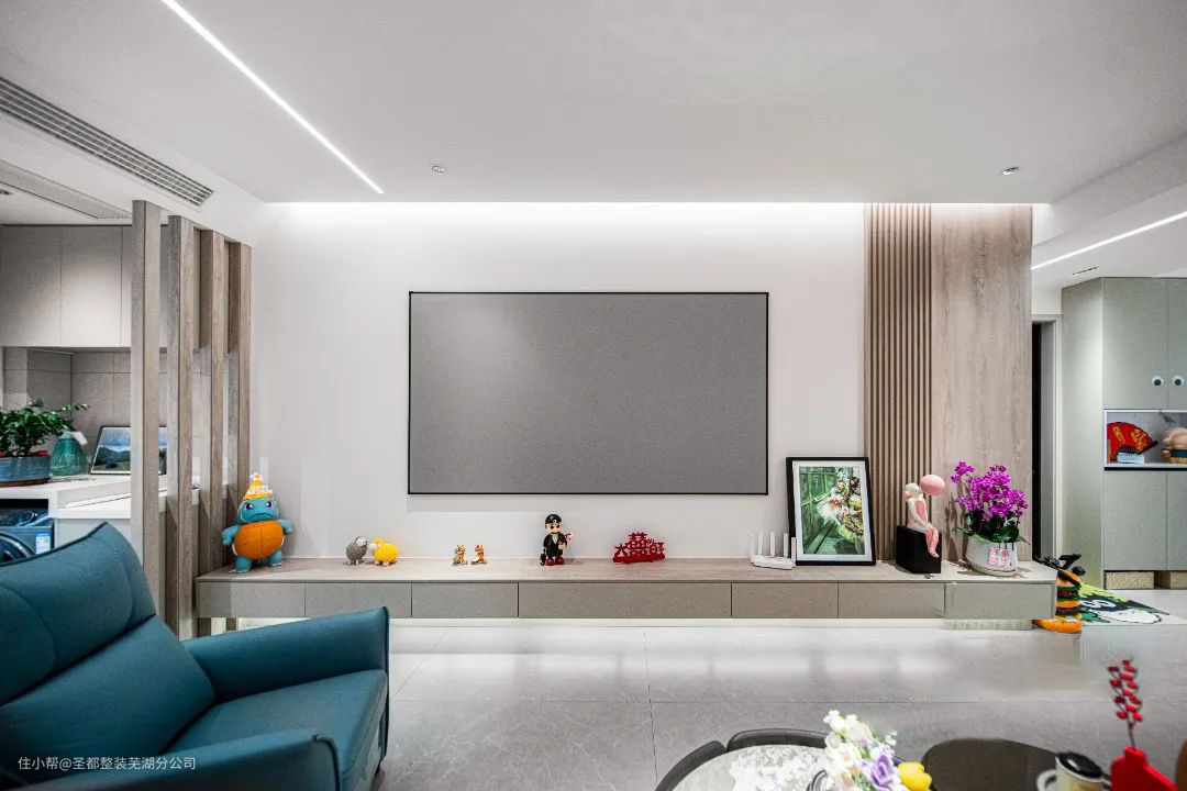 客厅的整体色调以亮色为主,爱马仕橙与深海蓝的搭配亮眼又夺目,表达了主任热情好客的品德,搭配大理石茶几,,时尚有格调。 无主灯设计开启散点照明模式,烘托出光影绰绰有余的氛围感,为空间增添趣味性与艺术感。本案业主是新婚夫妇,局部软装设计没用俏皮的玩偶和金属饰品点缀吗,整体温馨而又充满着生活气息。