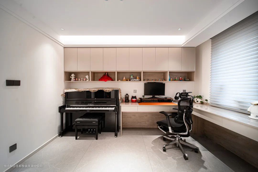 业主舍弃一个房间,打造开放式书房,定制橱柜采用开放式+封闭式形式,上方一排封闭式存放日常生活中的物品,中间打造开放式,用以摆放日常的书籍、摆件等。 下方左侧摆放女主人的钢琴,跳跃的黑白键在指尖飞舞,婉转、悠扬,右侧则是一体化的书桌,日常办公,娱乐皆可在此,休闲性与功能性的结合正满足年轻人的喜好。