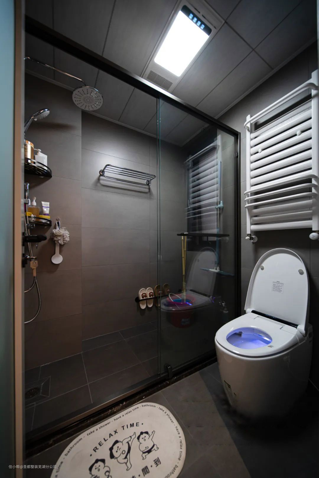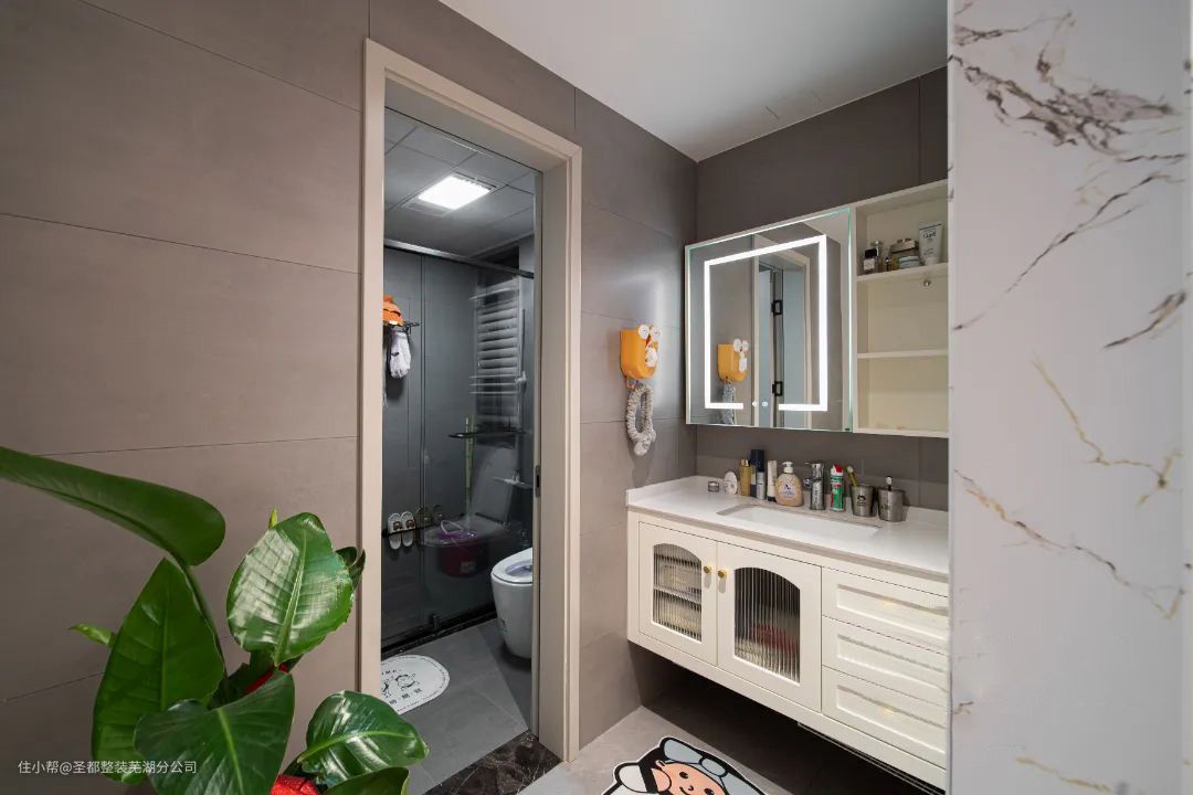 卫生间干湿分离,采用灰色瓷砖整体显得非常干净大气。洗漱台是经典白色,使得整体空间清爽而不单调。