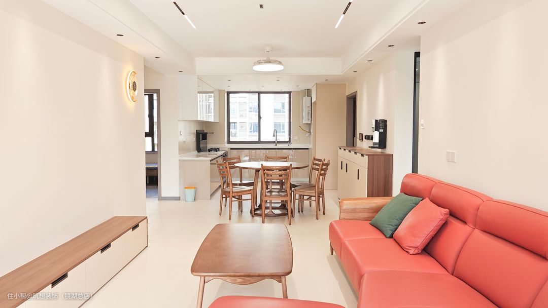客厅与餐厅并入一体,设计亮点在于设计师把一个整体空间划割成为客厅、餐厅、阳台3个功能区,全开放式布局,没有一丁点的拥挤感。把主卧门洞改到餐厅边上,缩短了回卧室的路程,更适合居家生活动线。