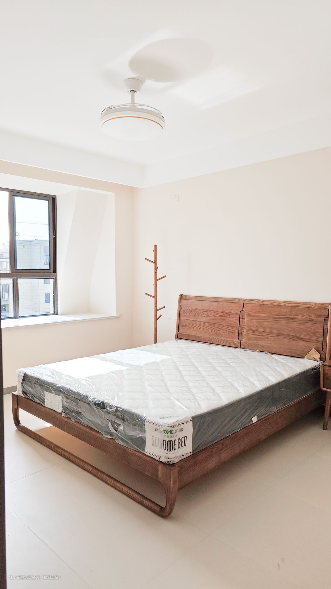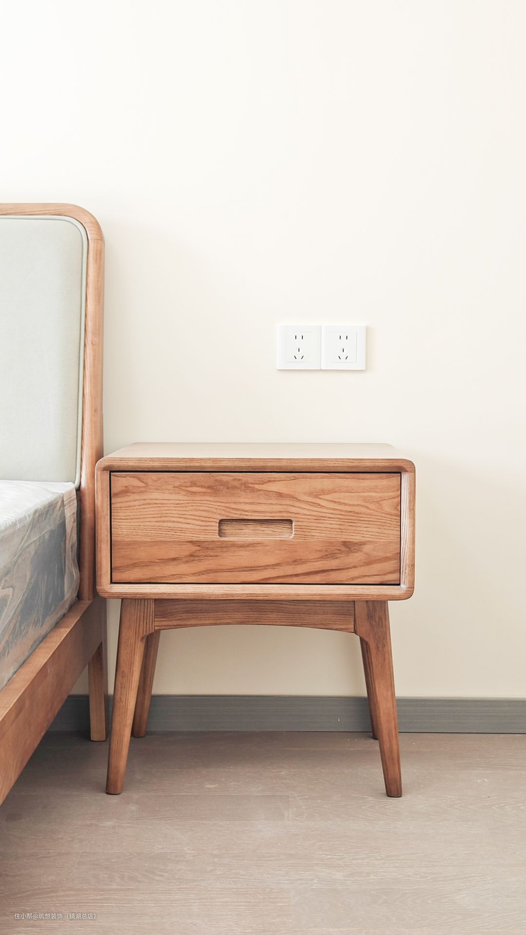 二楼卧室,储物功能是买的成品柜。暖黄漆色,搭配原木家居,既遥相呼应又舒适自然。