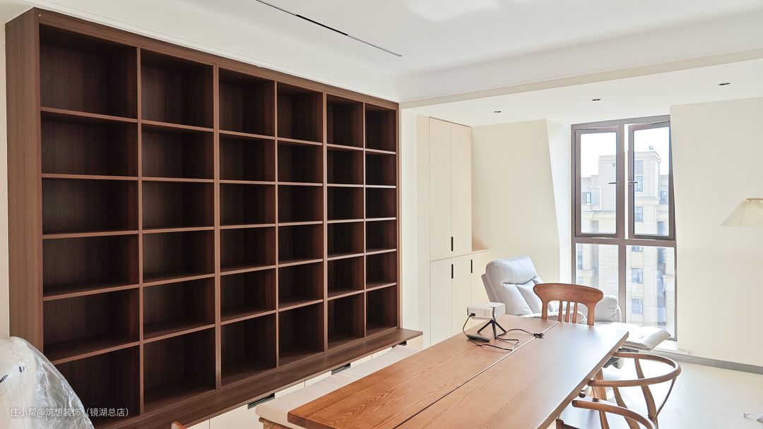 涂刷的冬日黄昏漆色,中间放置一张简约实木办公桌,在白纱的衬托下,格外清雅。 设计师将书桌摆放正中间靠窗一点的位置,利用光斜射到桌面上的角度,引入光线效果让人非常舒适。 书桌的背面是一整排开放式+封闭式书柜,美感中更显书香内涵。