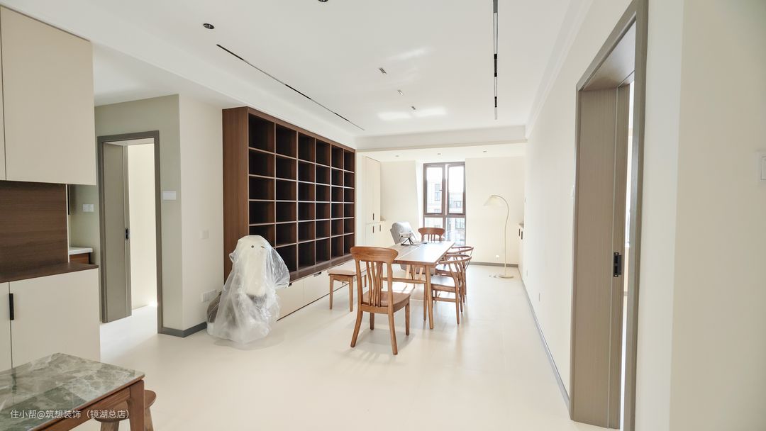餐厅白色乳胶漆墙面,客厅风格的延续,餐边柜做的是半柜设计,可移动插座,方便实用。木质餐桌高级感满满,搭配原木餐椅,俏色处理不显沉闷。餐厅望像客厅,整体空间统一,光线充足。